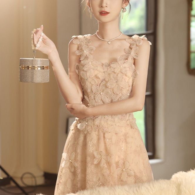 立体的な花刺繍が美しいレース素材とチュールを組み合わせた、韓国風の袖なしロングフォーマルドレスです。