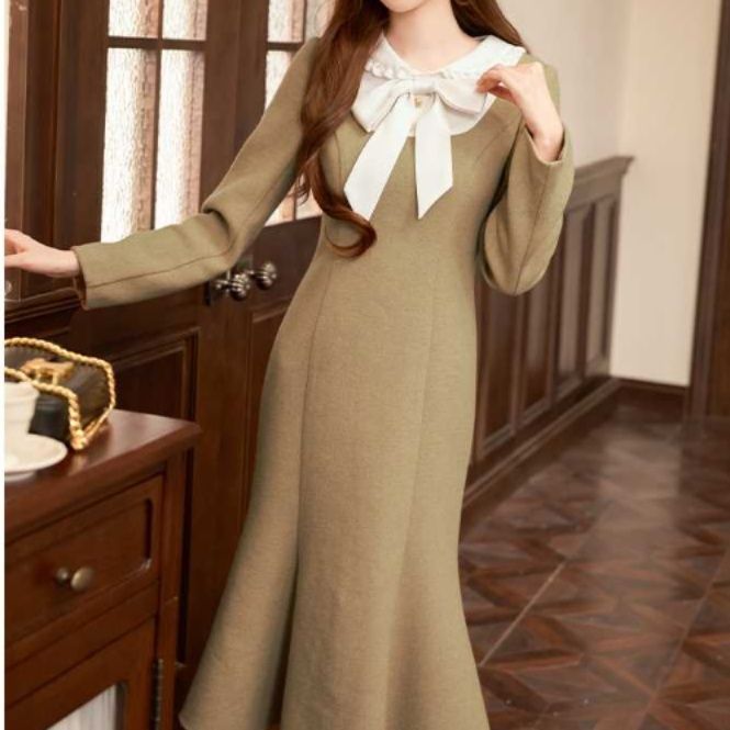 結婚式お呼ばれレトロなリボン襟付きフレアマーメイドドレス