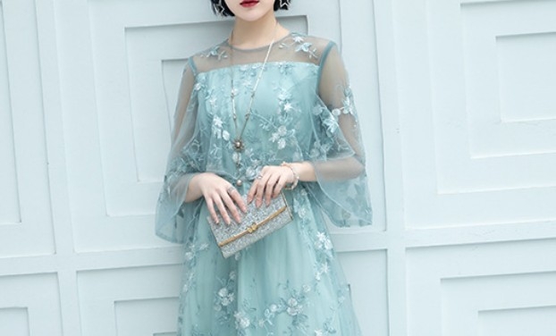 シースルー素材のフレア袖と花柄刺繍が調和したお呼ばれドレスは、結婚式の二次会やパーティーにも最適な一着となっています。