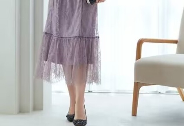 ミモレ丈のスカートは裾にレースをあしらい、動くたびに揺れる優雅なデザインが魅力的です。