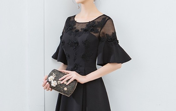 シースルーのレース素材とフレア袖を組み合わせたお呼ばれドレスです。
