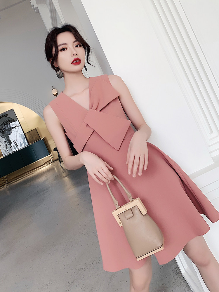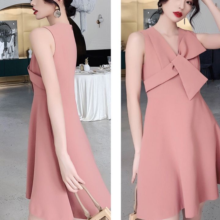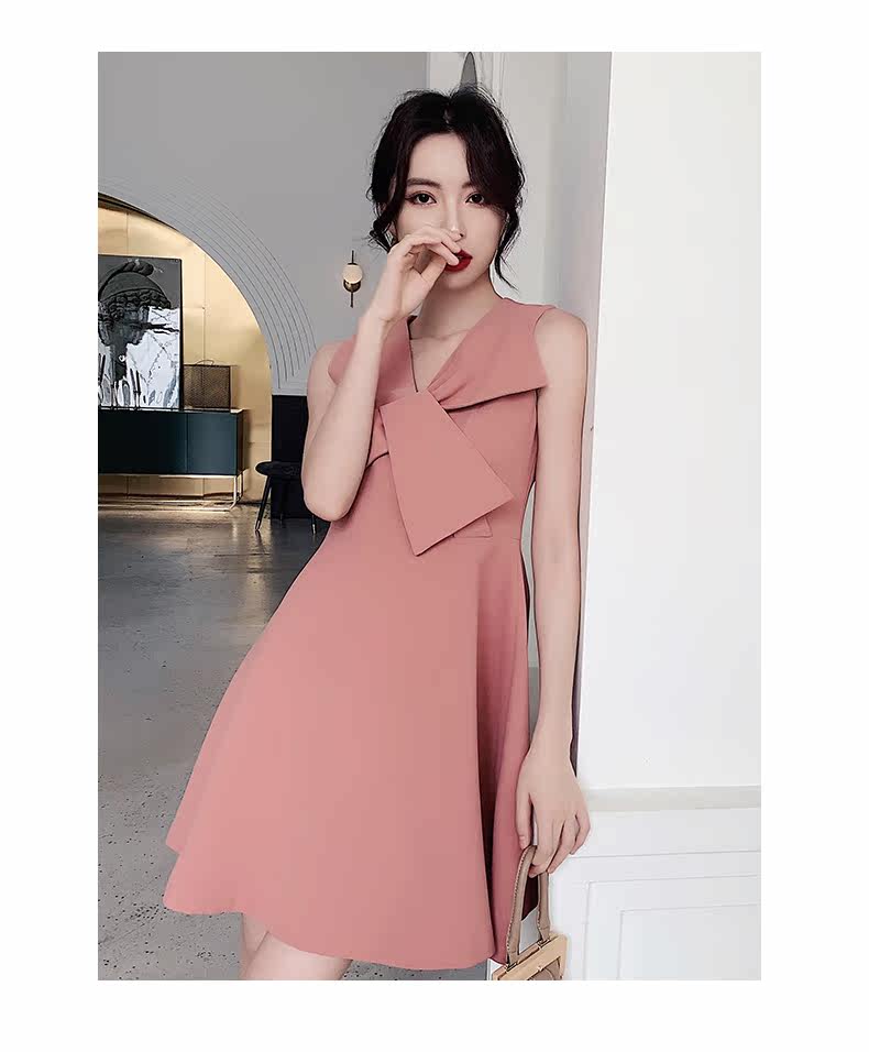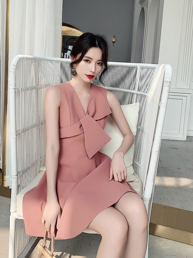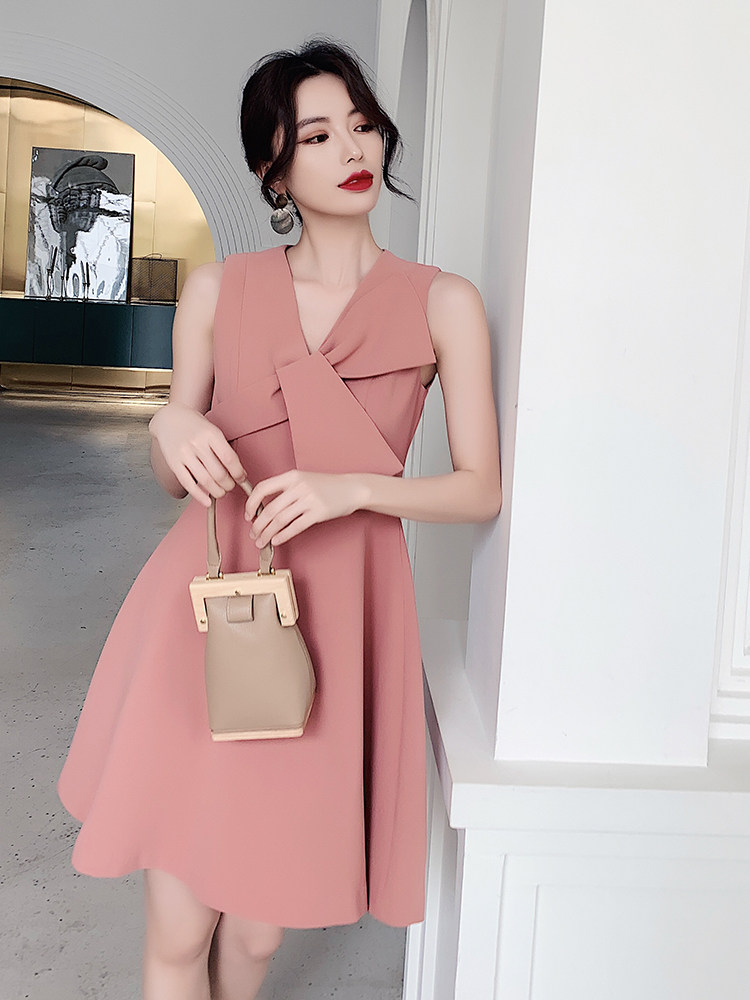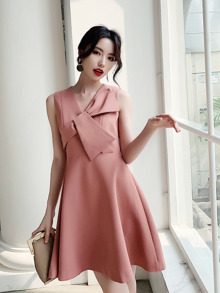 ノースリーブのすっきりとしたシルエットに、立体的なリボンがアクセントとなり、上品でエレガントな印象を演出します。