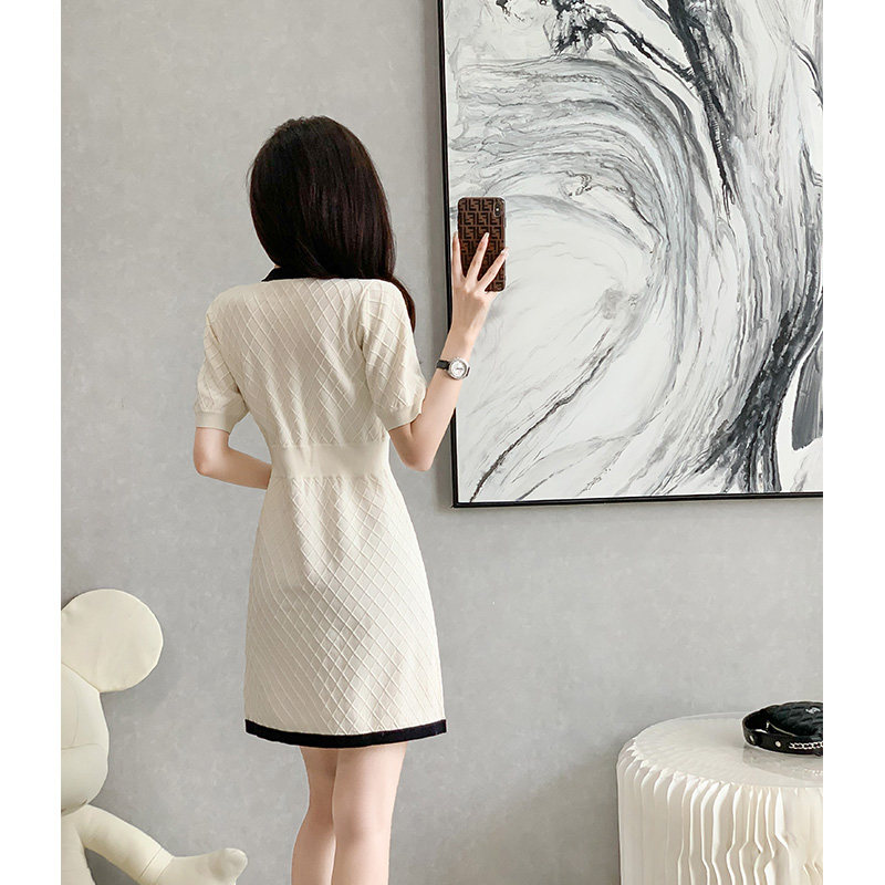 配色のパイピングとボタンがアクセントになったワンピースは、結婚式やパーティーなど様々な場面で活躍します。
