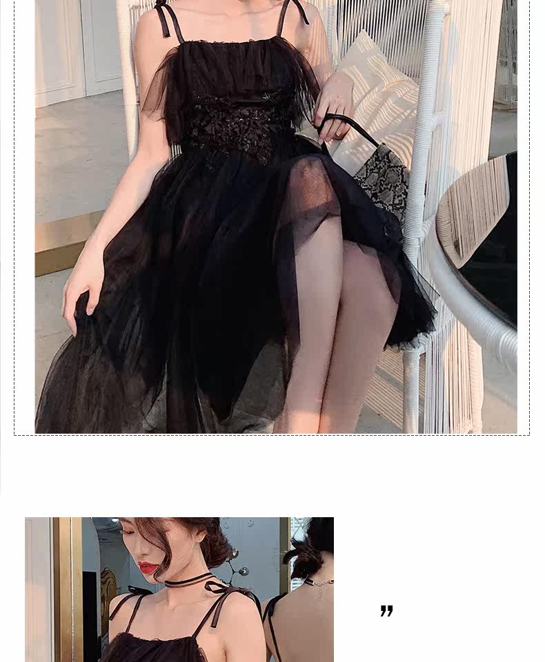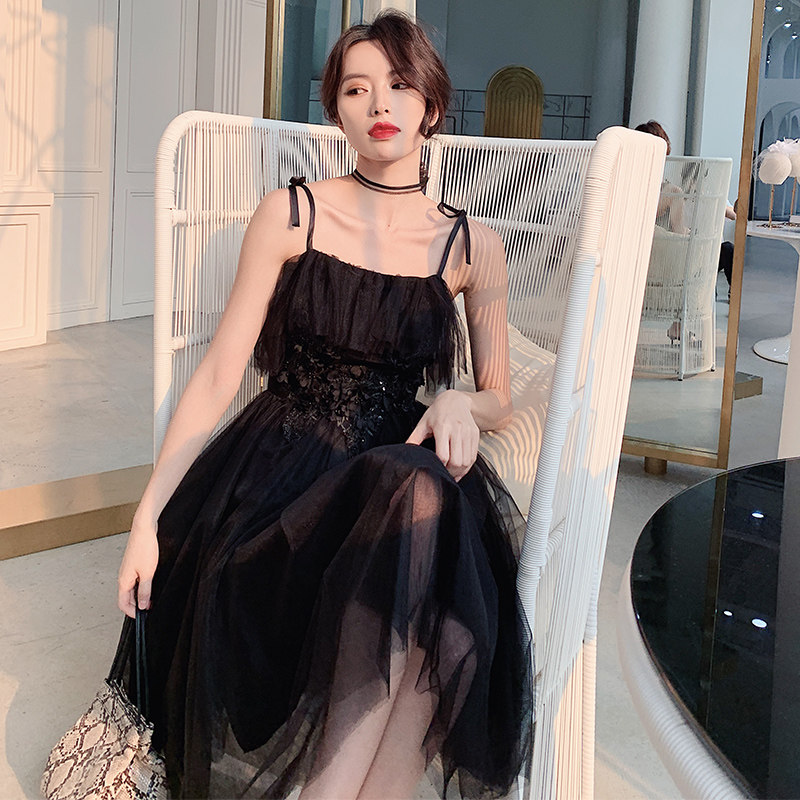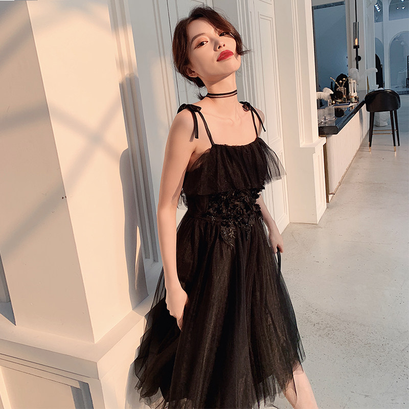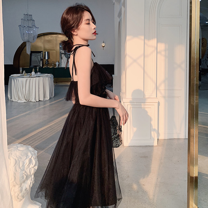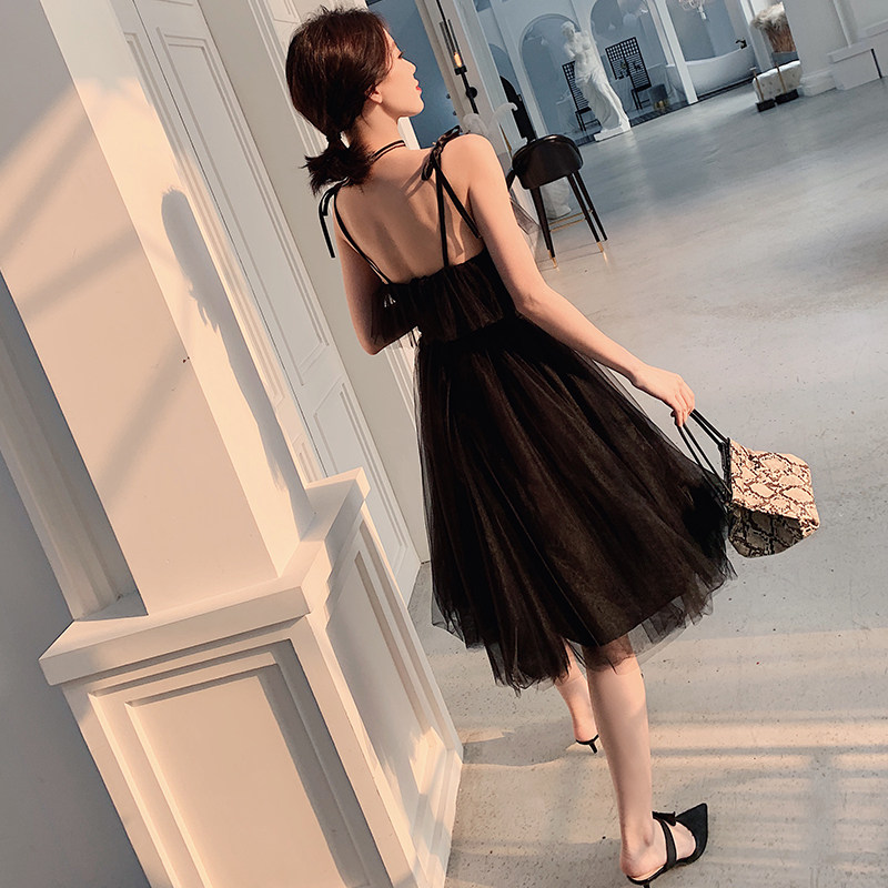肩紐はリボン結びのデザインで背中を美しく見せ、ふんわりと広がるチュールスカートが優雅な雰囲気を醸し出します。
