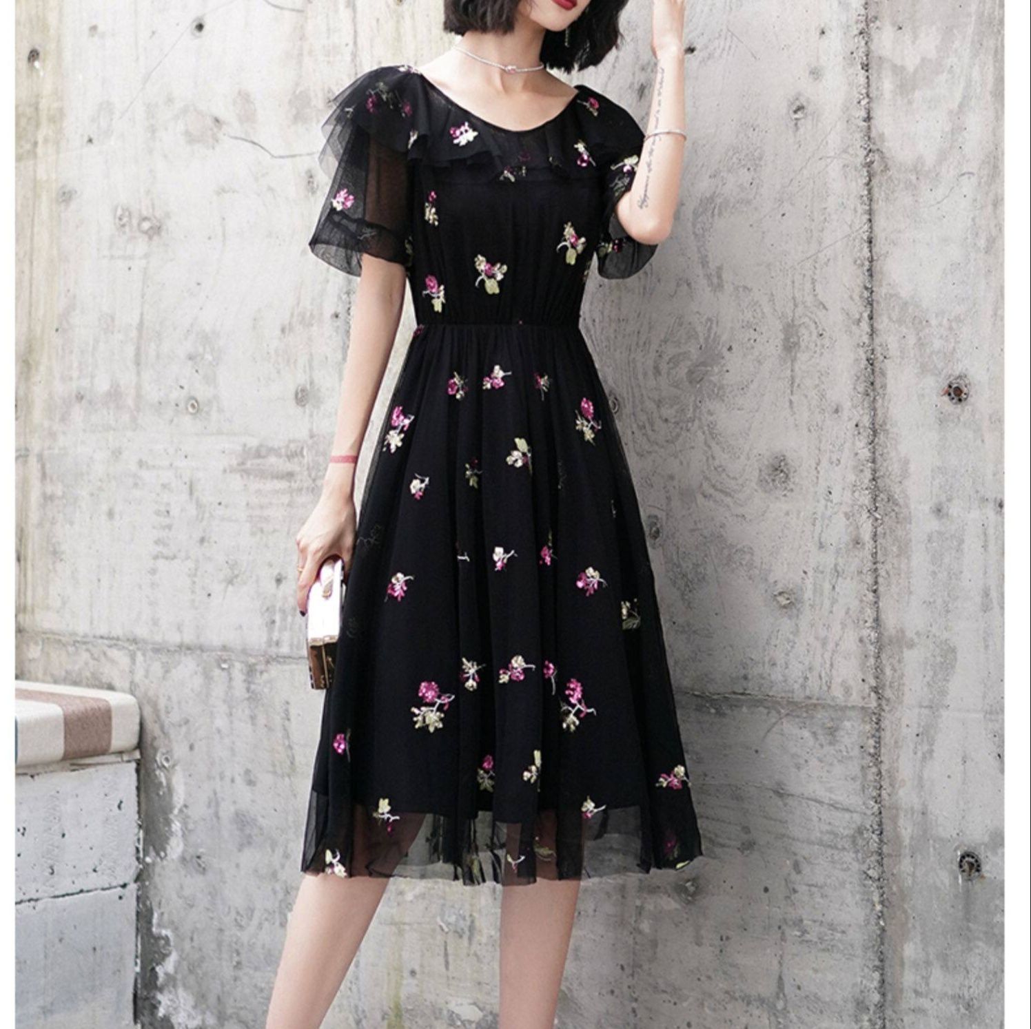 繊細な花柄刺繍が全体に散りばめられた上品なオケージョン ドレスです。