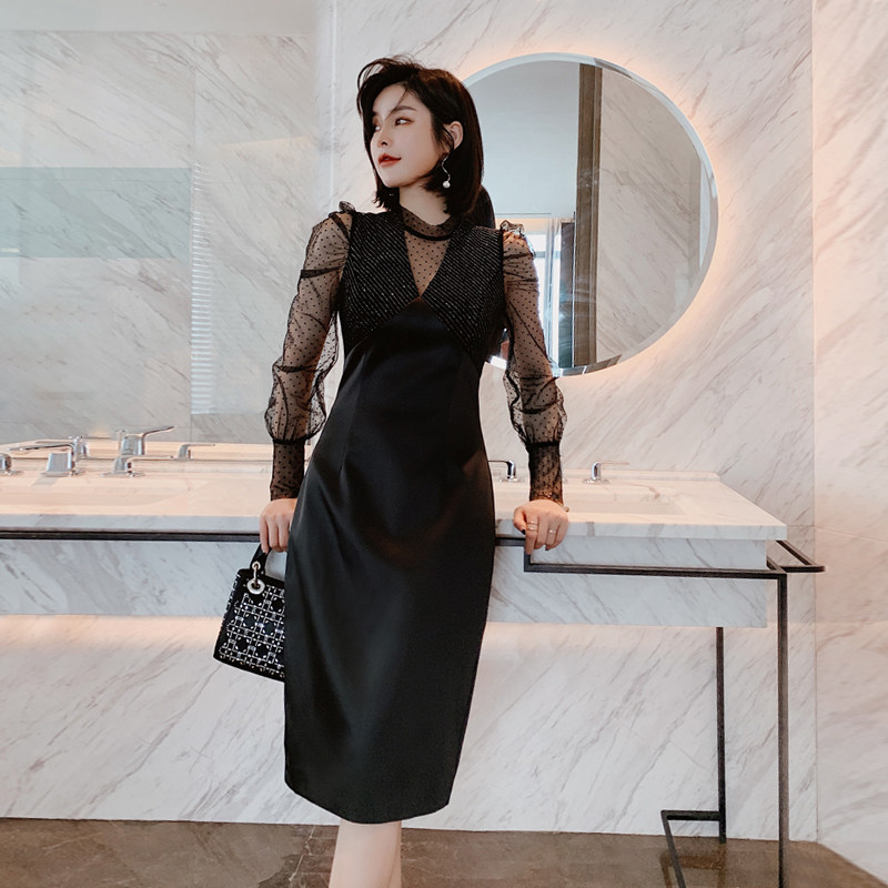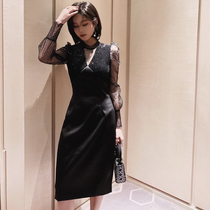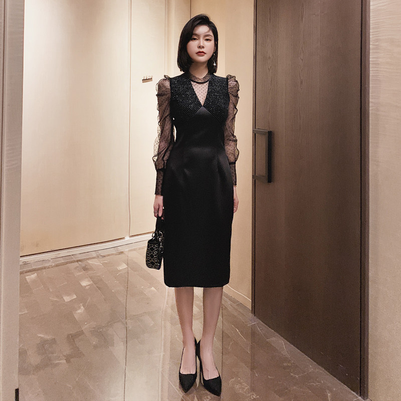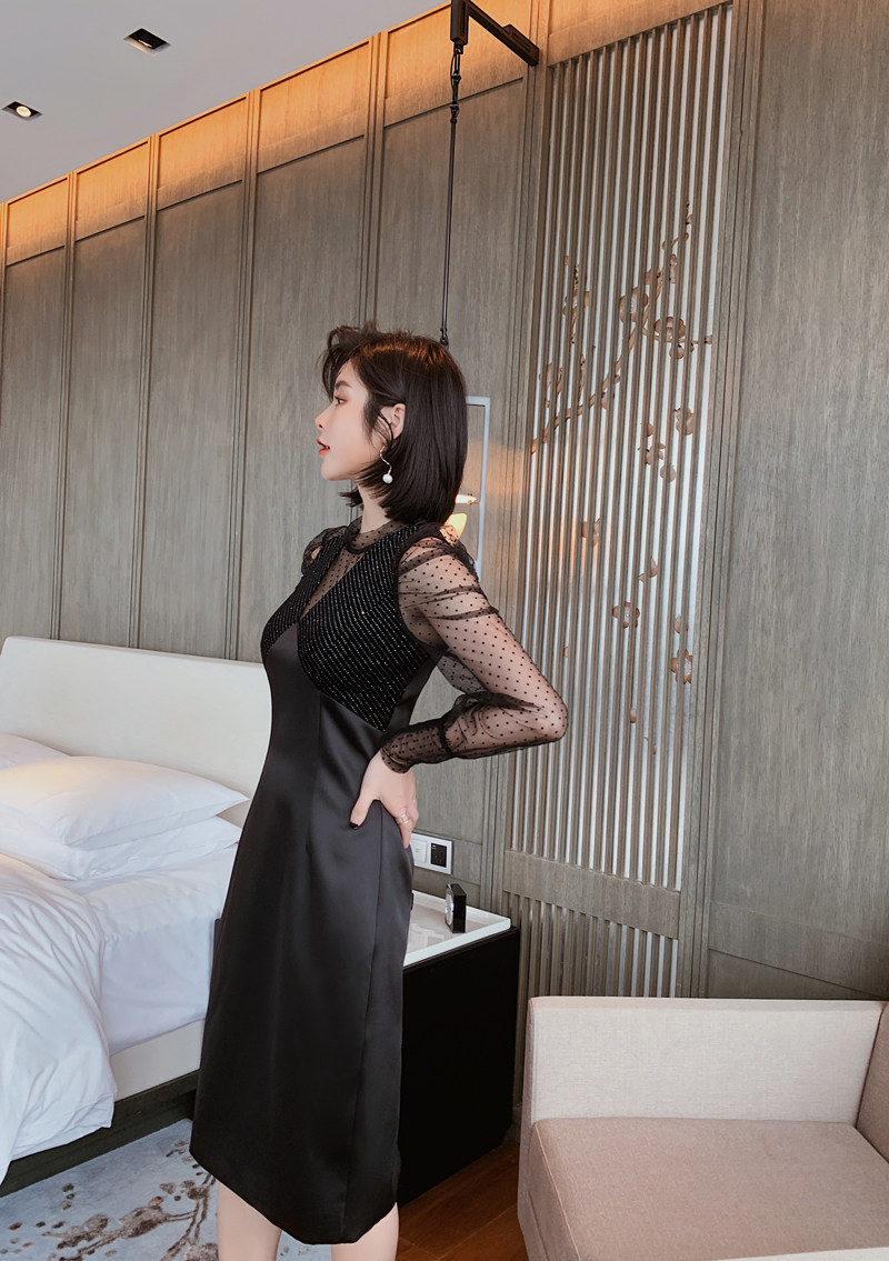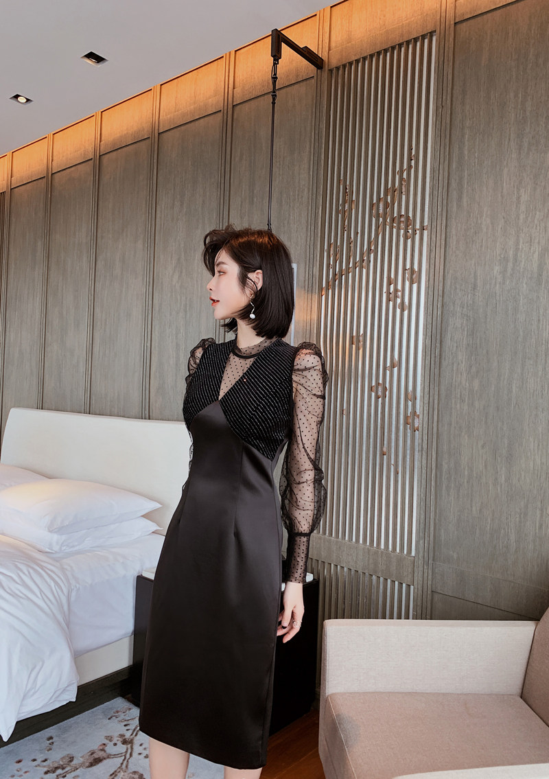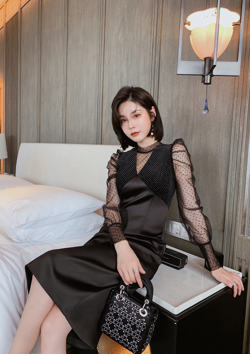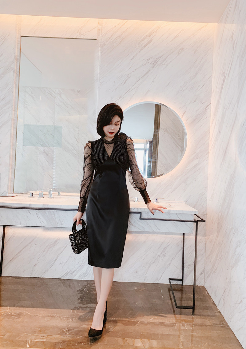 胸元のビジュー調装飾とレース使いが上品さを演出し、すっきりとしたタイト型ミディ丈シルエットが女性らしさを引き立てます。
