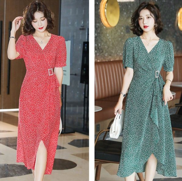 ブイネックのカシュクールデザインが女性らしいラインを演出し、ウエストのリボンベルトでスタイルアップ効果も抜群です。