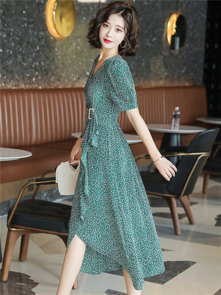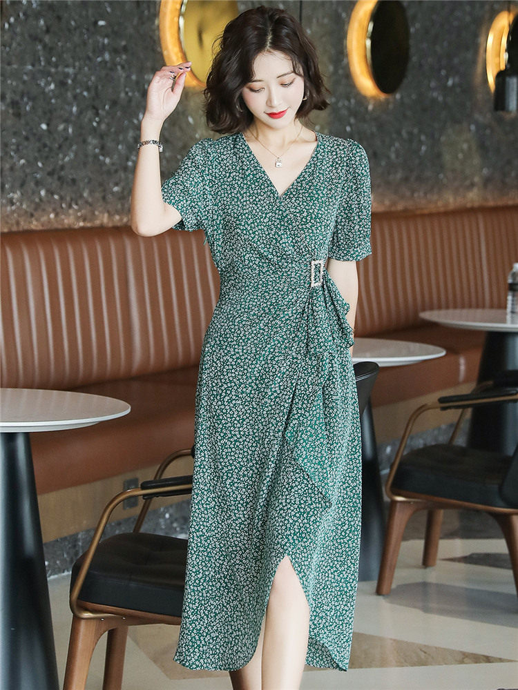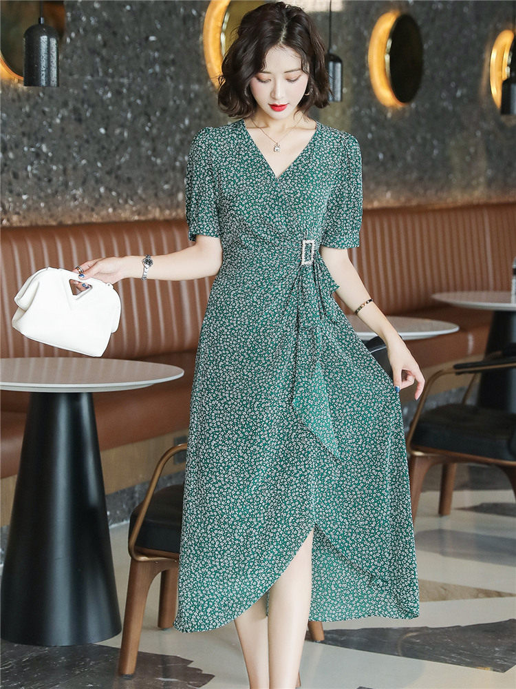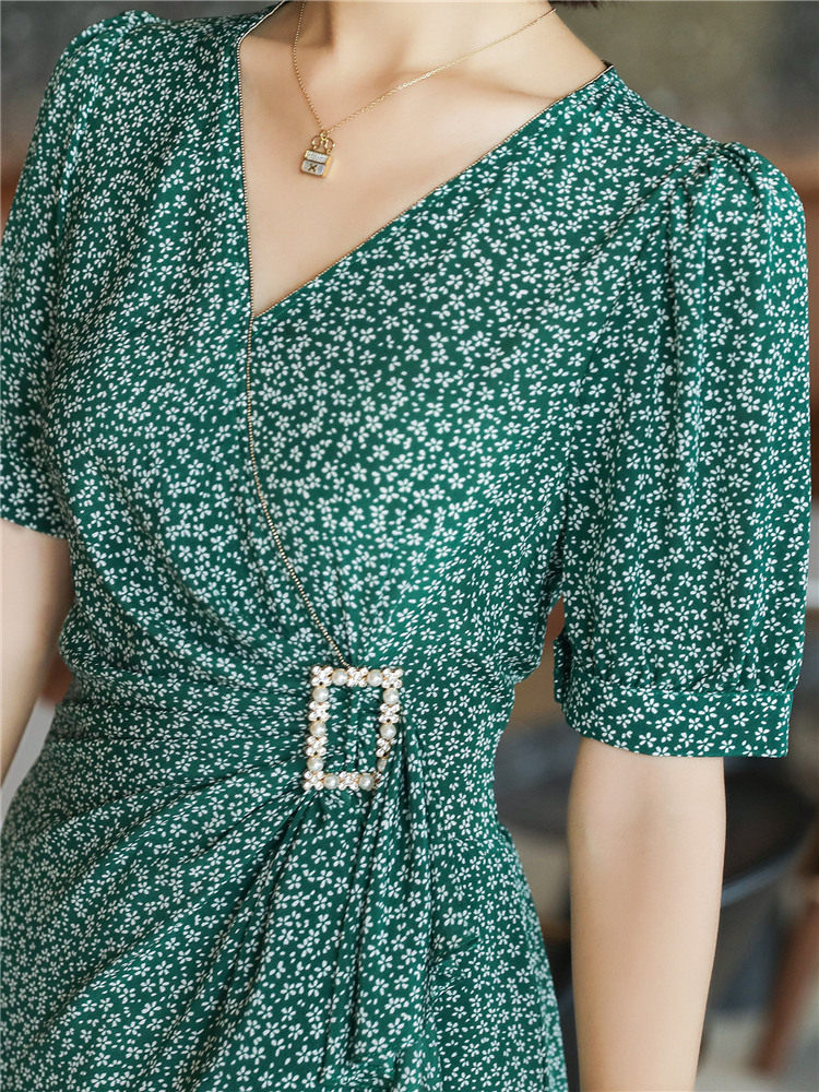 上品な小花柄が可憐な印象を与えるオケージョン ドレスです。