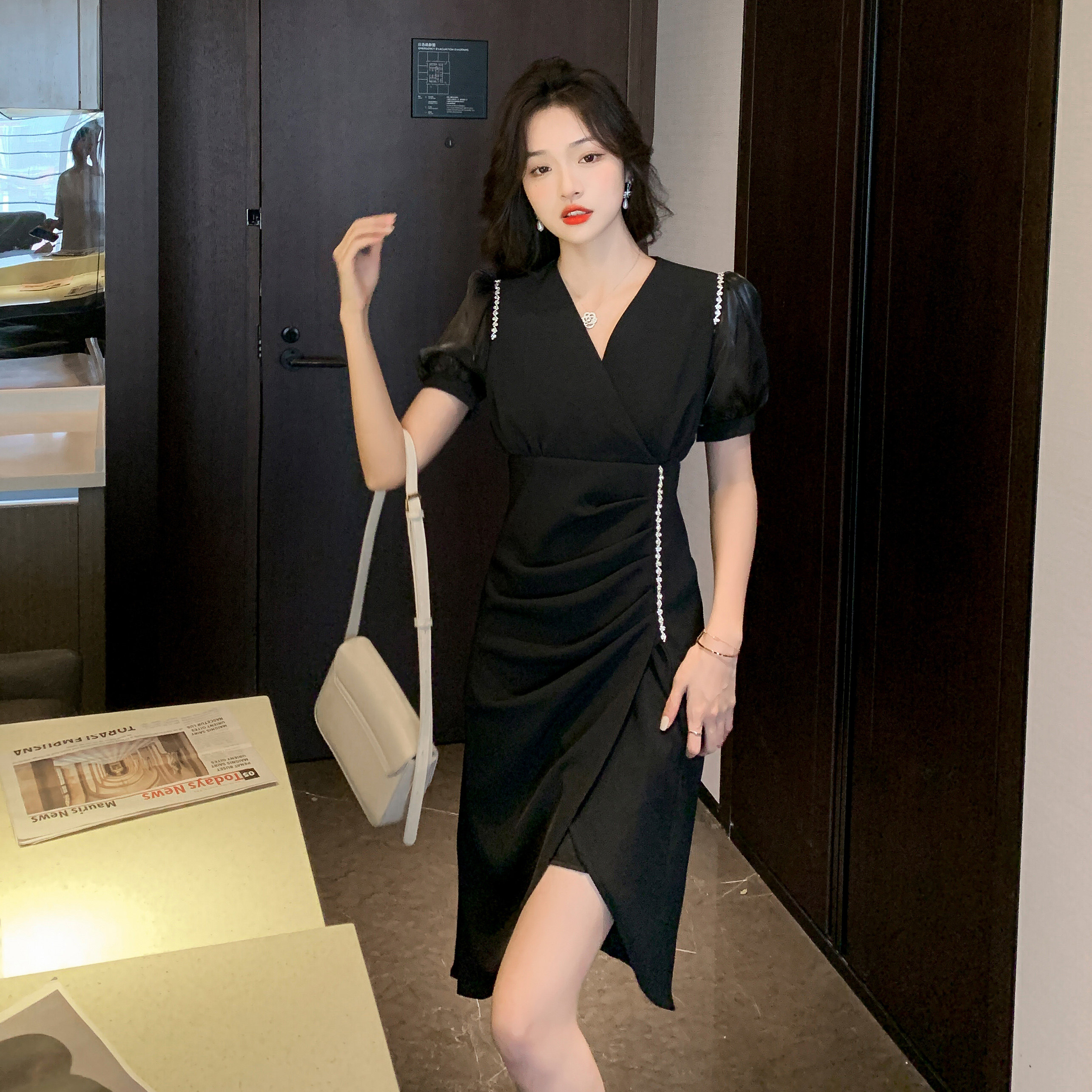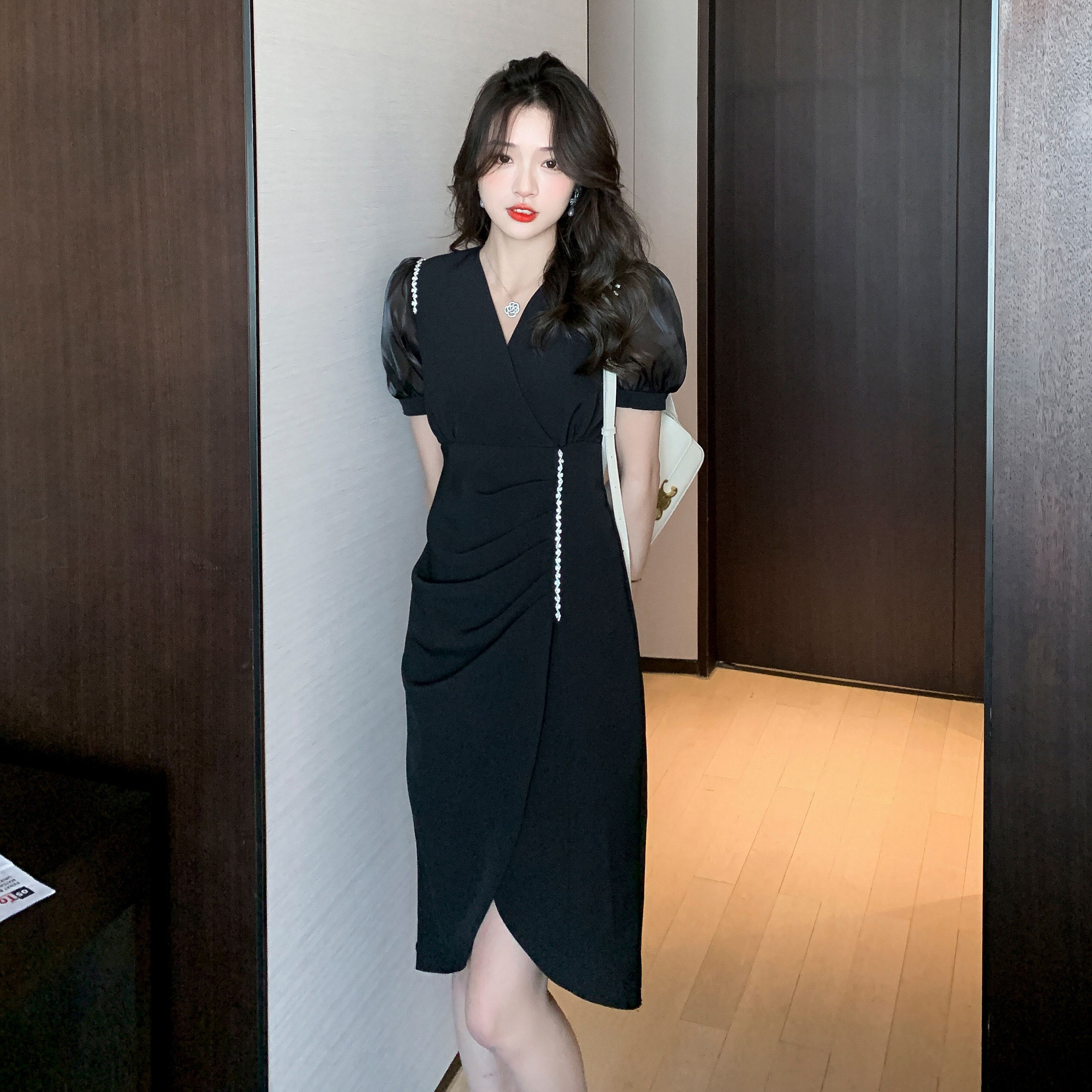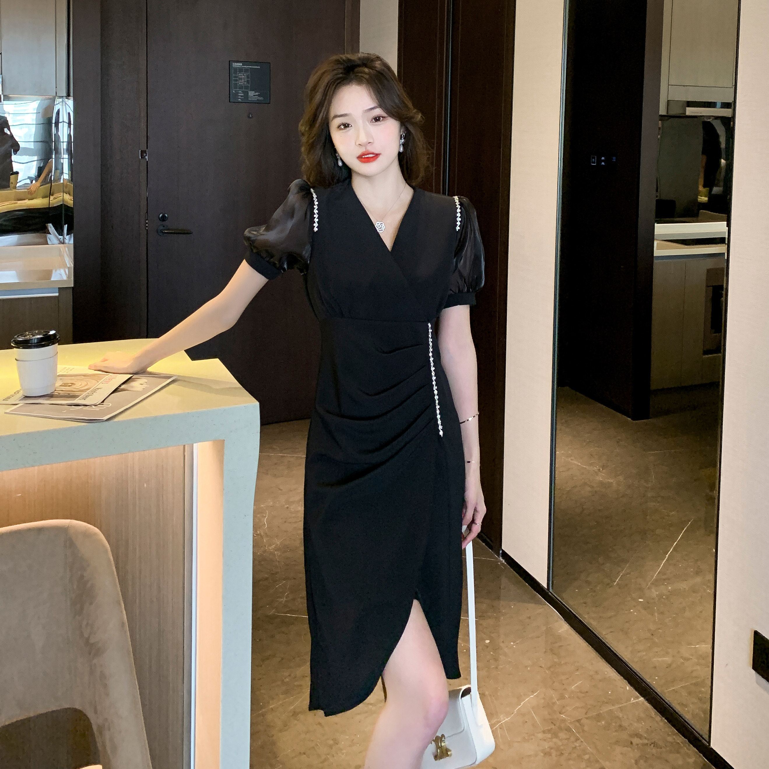 身体のラインを美しく見せるドレープデザインと、動きに合わせて揺れる裾のスリットが女性らしさを引き立てます。