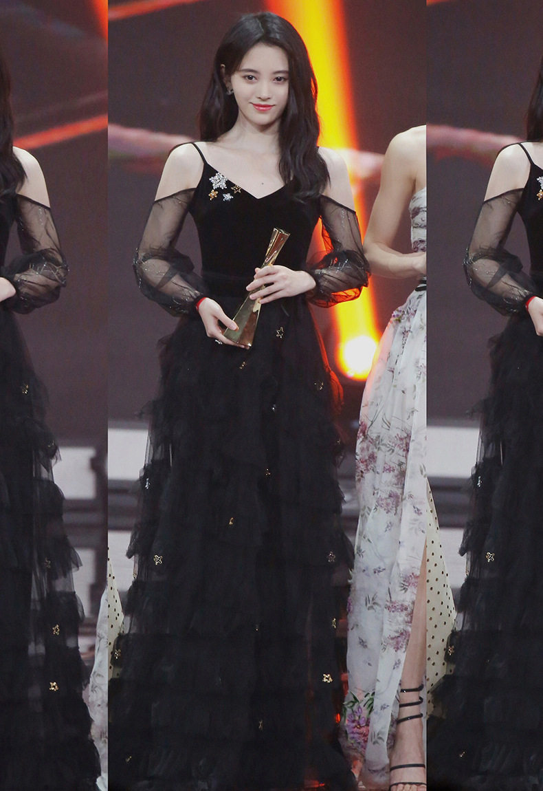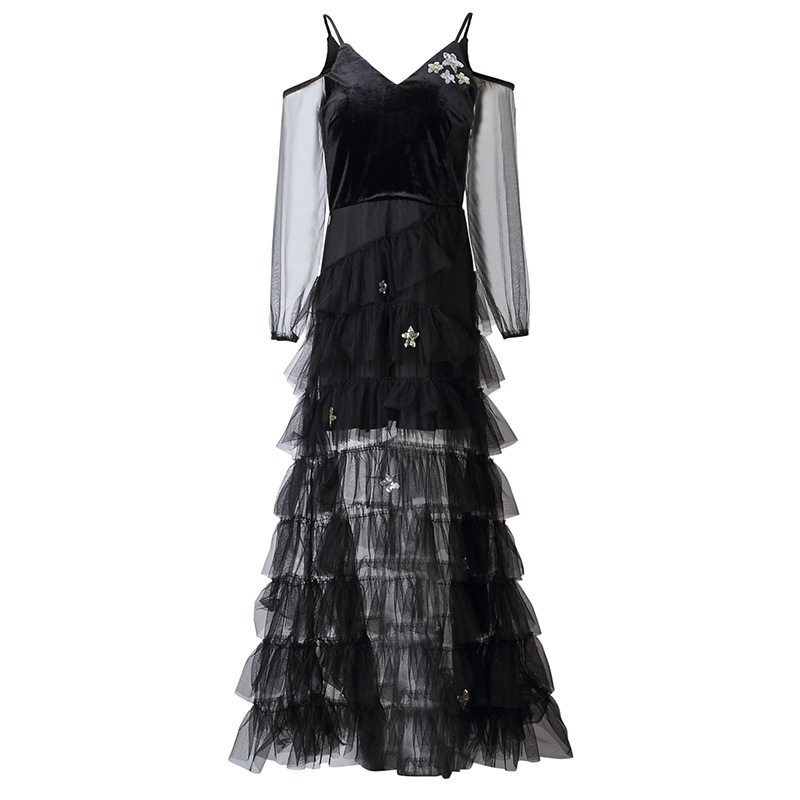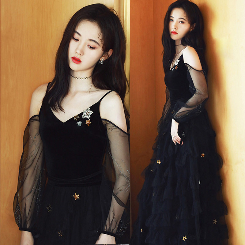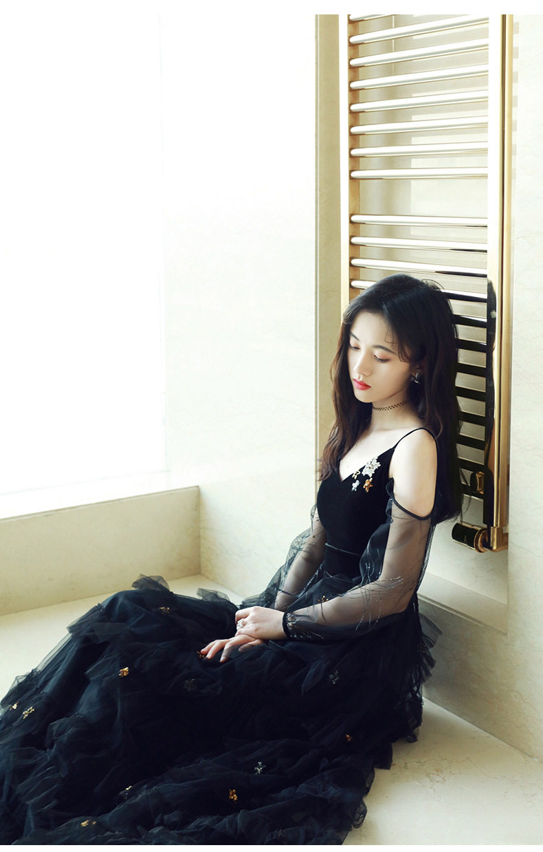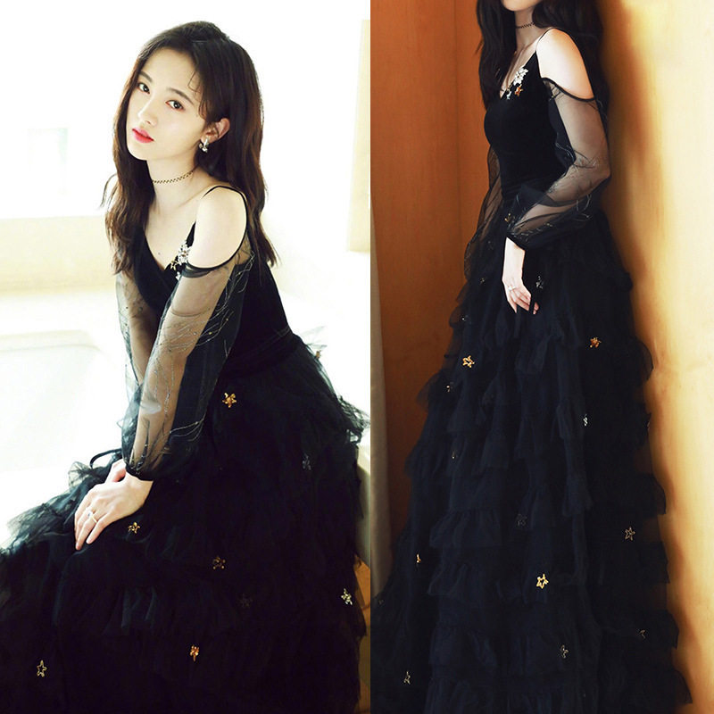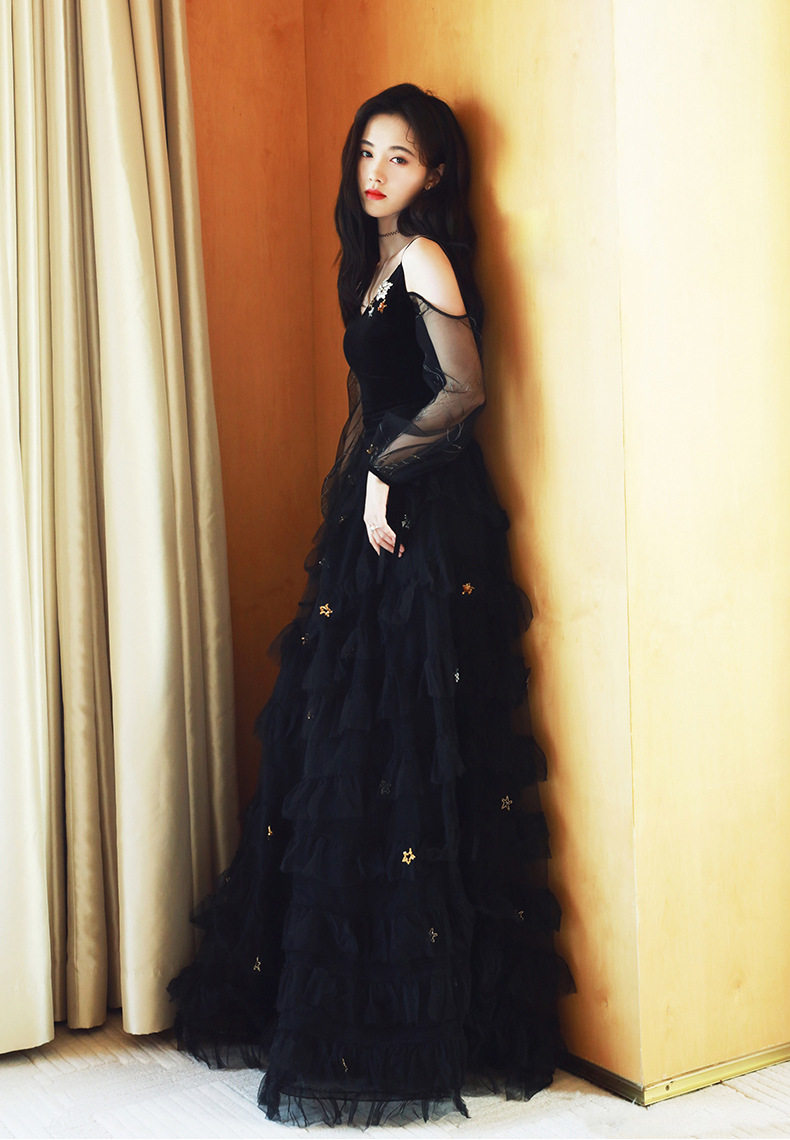 透け感のある刺繍入りシアースリーブと、星モチーフが散りばめられた豪華なチュールスカートが特徴的なデザインです。