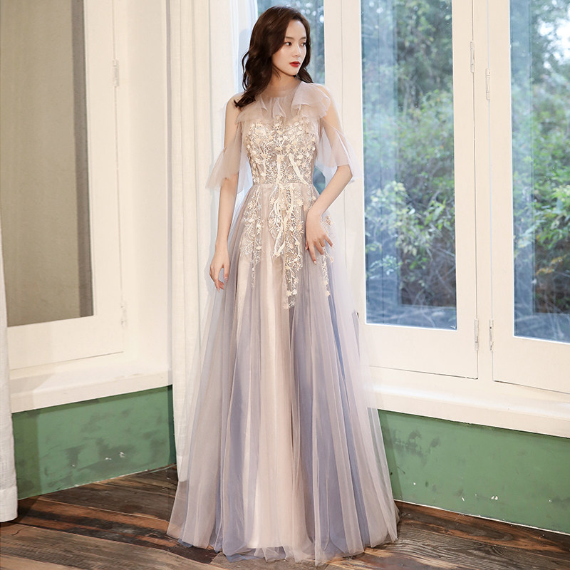 透け感のあるチュール素材の袖がエレガントな印象を演出し、身頃全体に施された立体的な刺繍が華やかさを際立たせます。