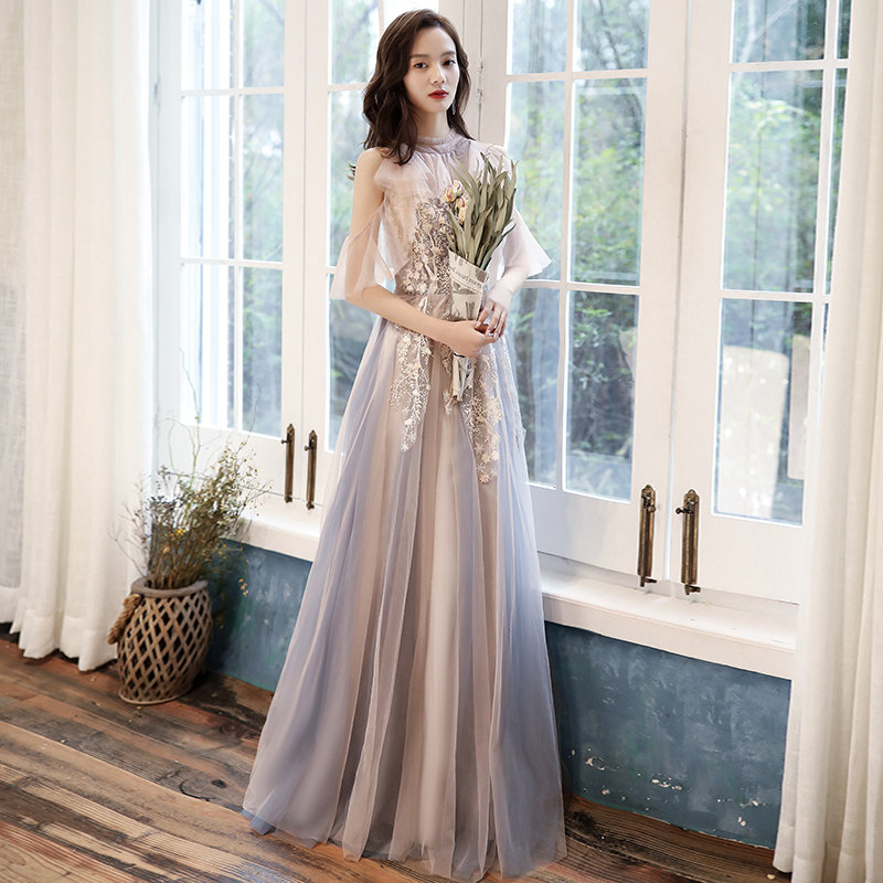 ハイネックデザインとフリルスリーブが上品さを加え、ふんわりと広がるロング丈のスカートが優雅な雰囲気を醸し出します。