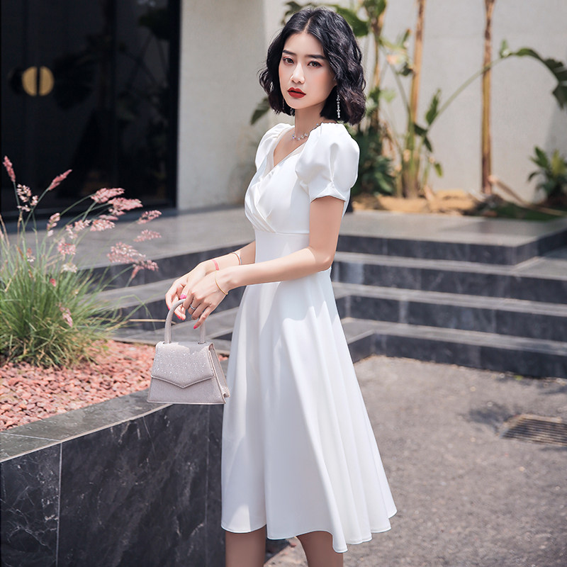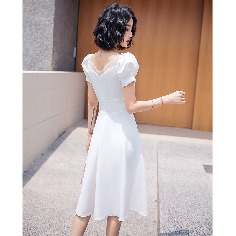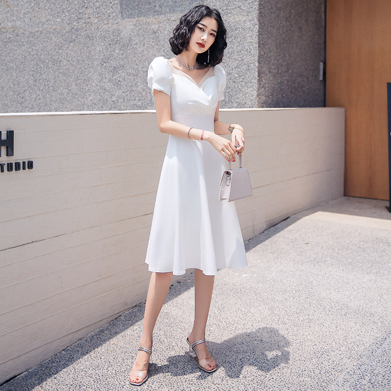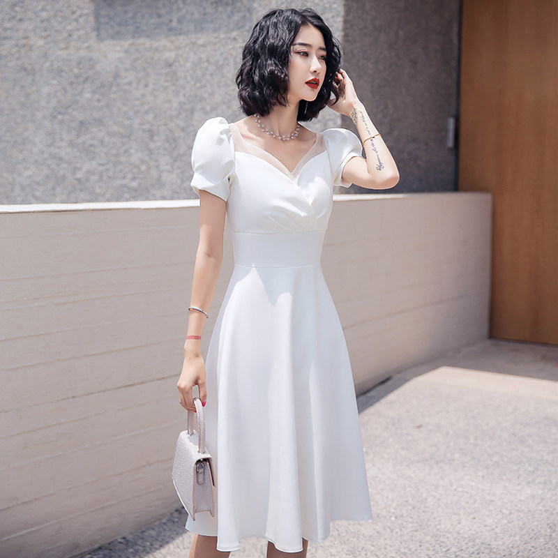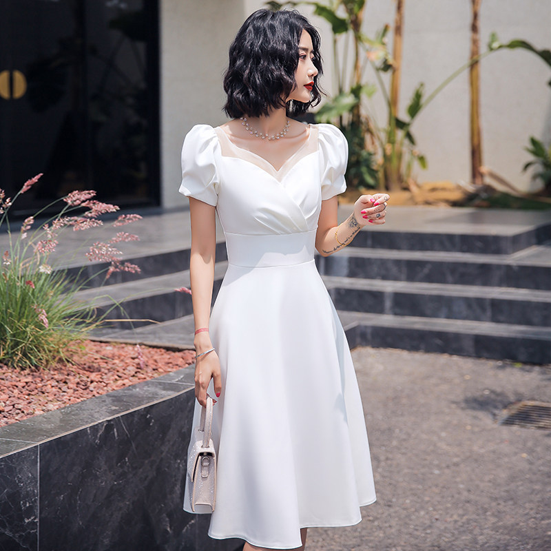 ふんわりとしたパフスリーブと上品なハートネックが魅力的なオケージョン ドレスです。