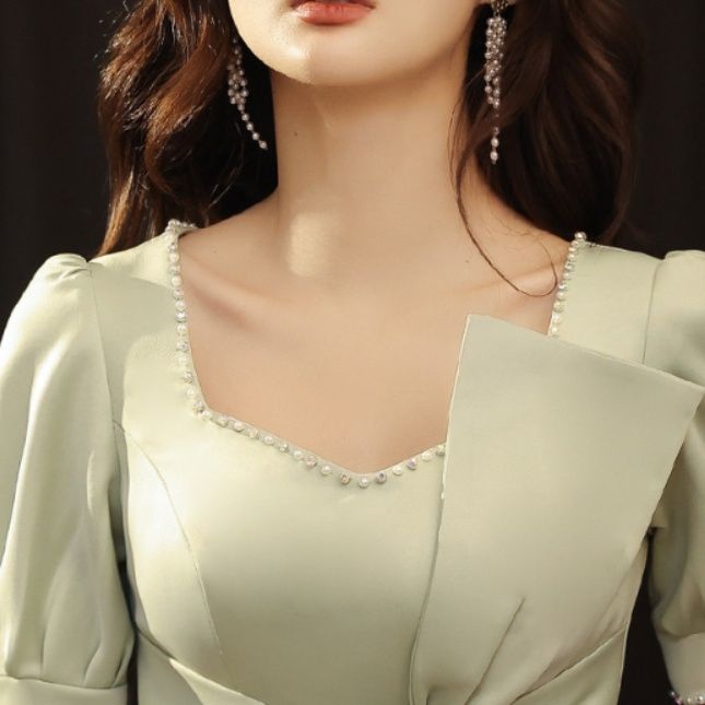襟元と袖口にあしらわれたパール風の装飾が華やかさをプラスし、結婚式や二次会などの特別な日にぴったりのワンピースです。
