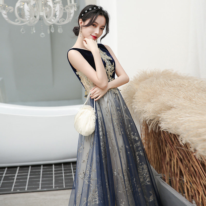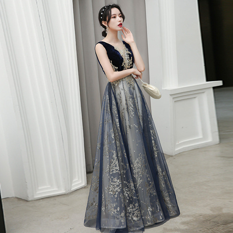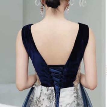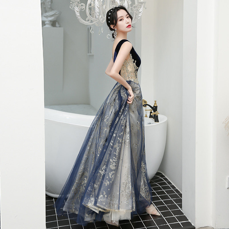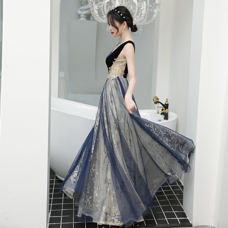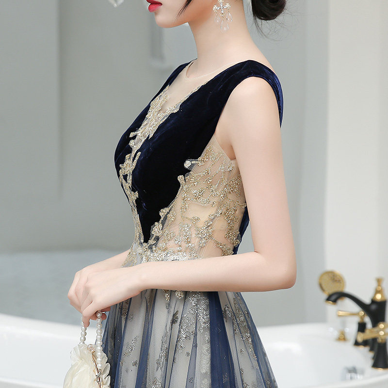 深めのVネックラインがデコルテを上品に演出し、ベルベット素材のボディ部分と軽やかなチュールのスカートが見事に調和しています。