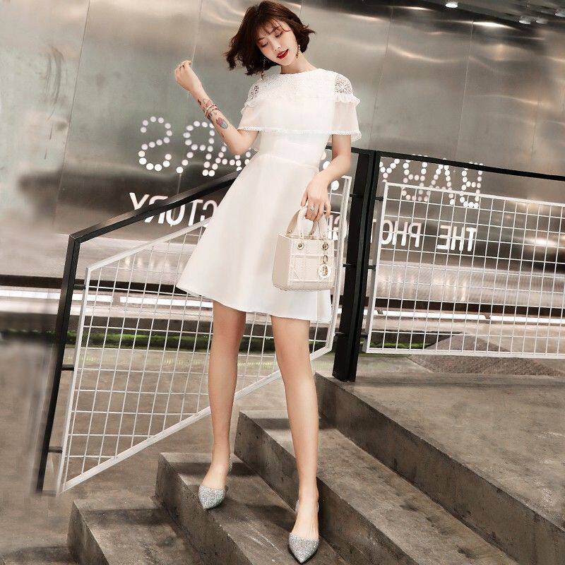 透け感のあるシフォン素材のケープ風デザインが二の腕をさりげなくカバーしながら、女性らしい柔らかな雰囲気を醸し出します。
