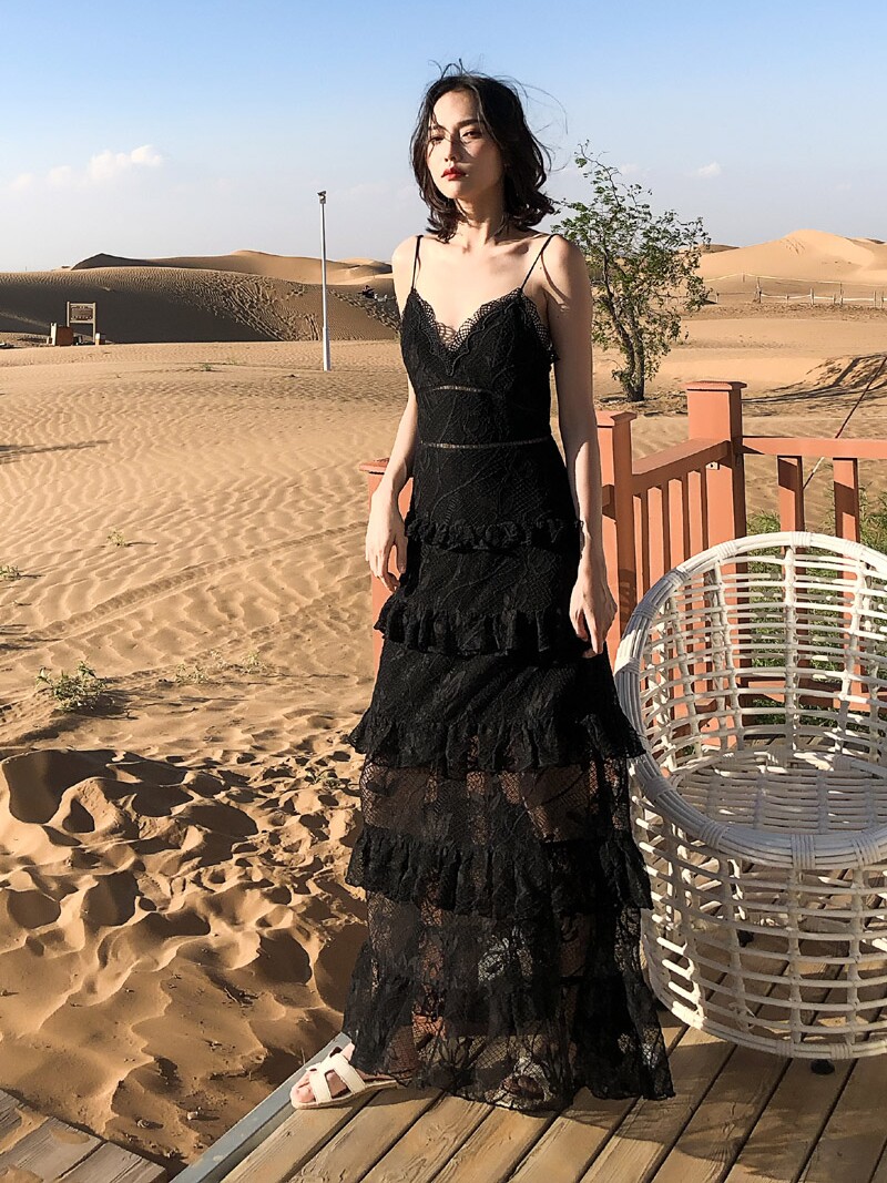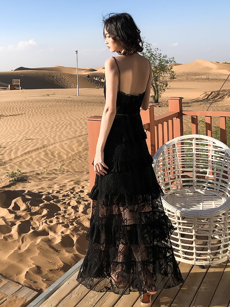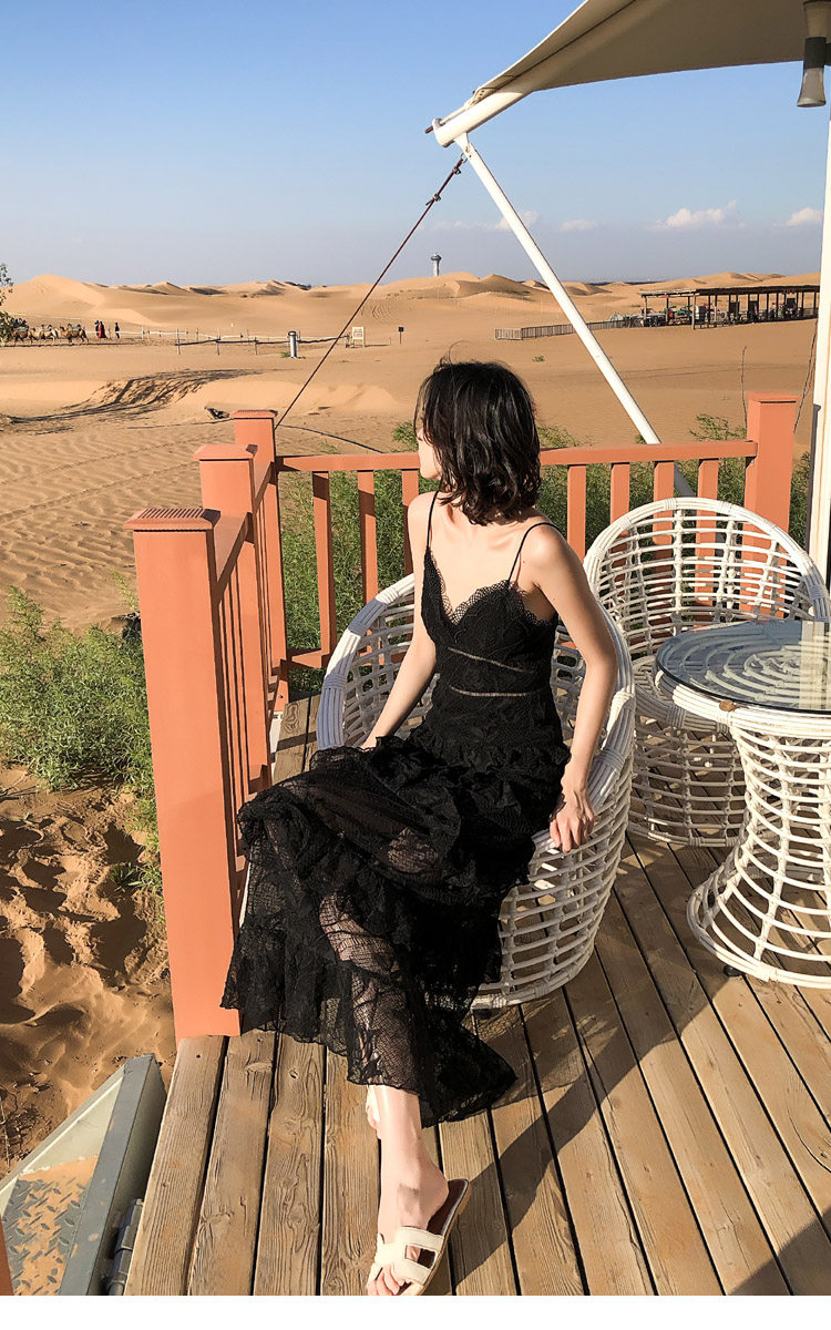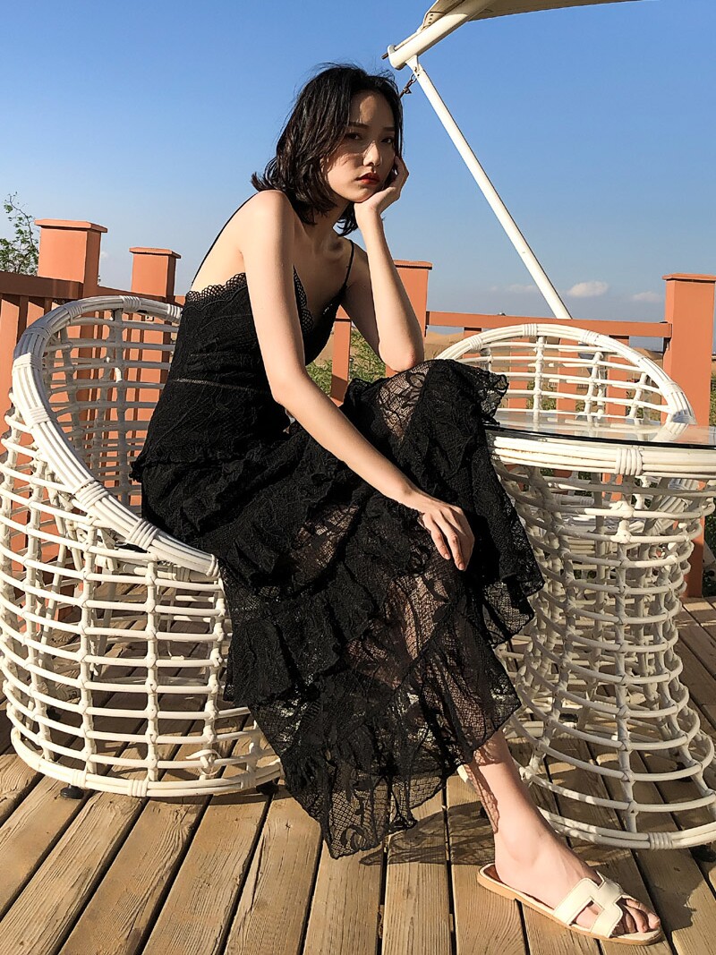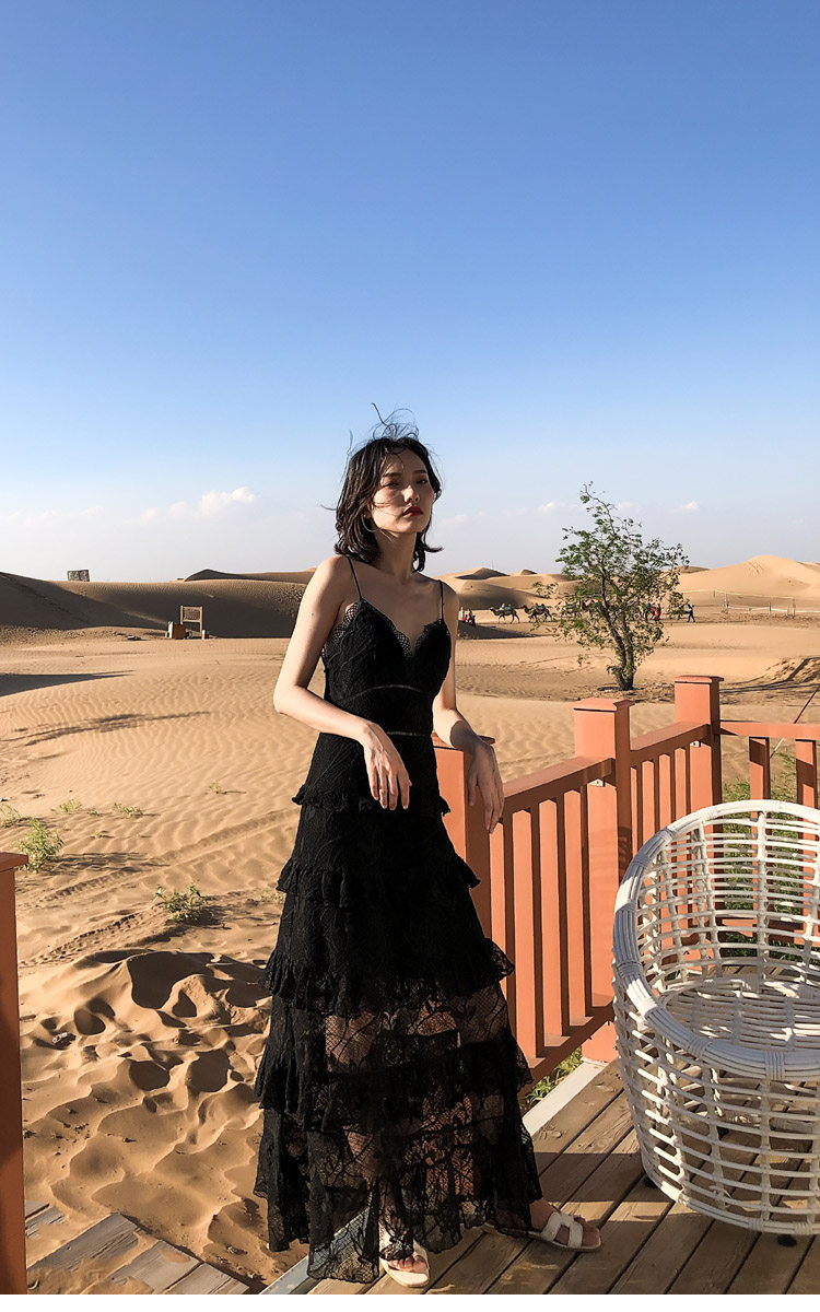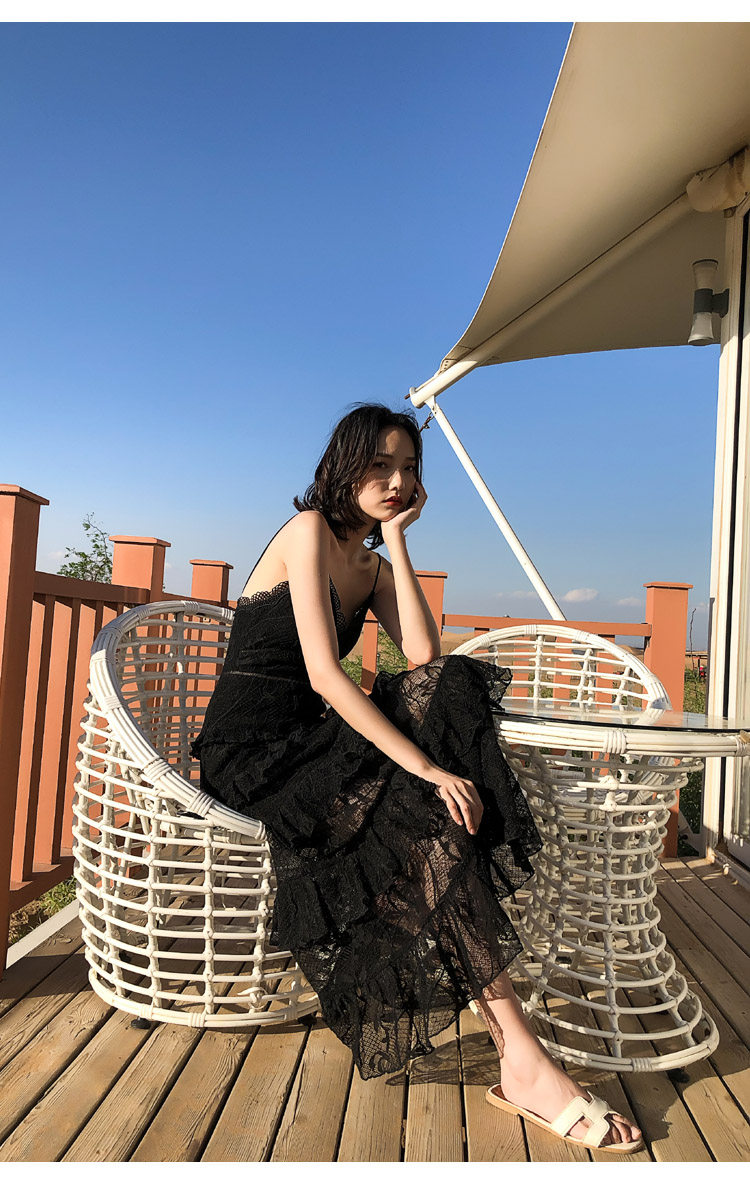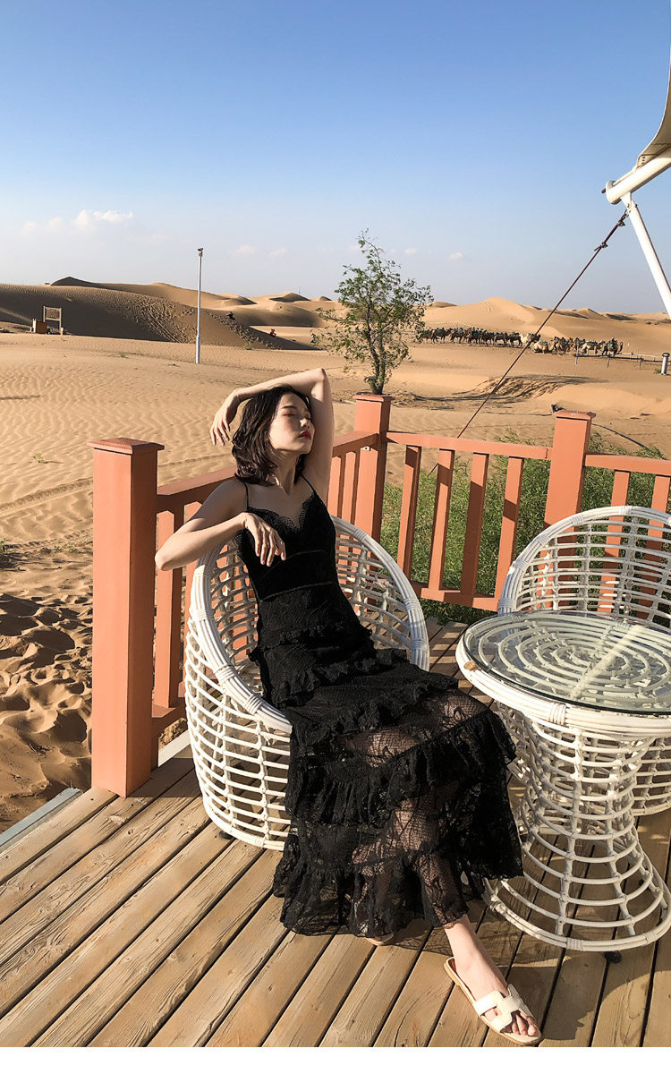 ウエスト部分の切り替えラインがスタイルアップ効果を発揮し、ティアード状に広がるレーススカートが優雅な印象を与えます。