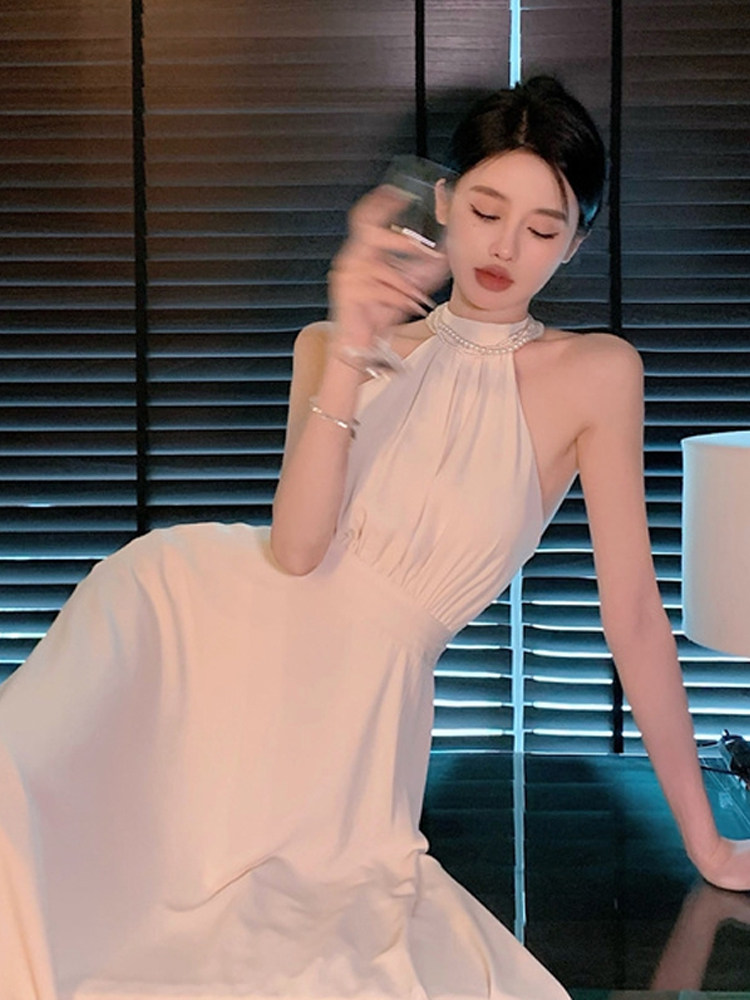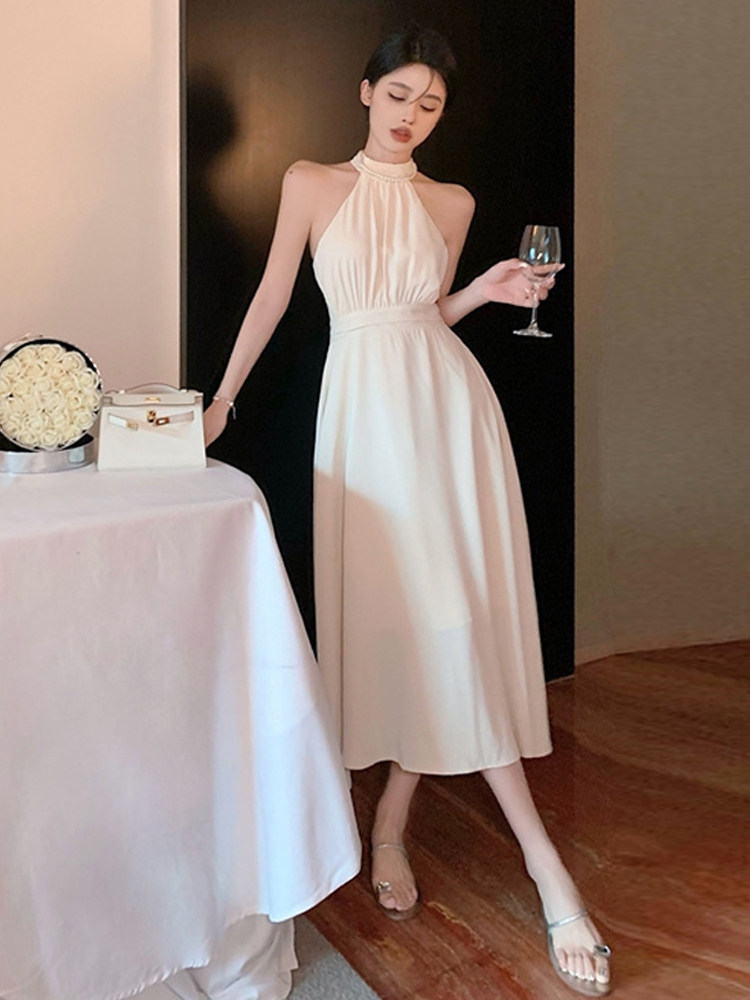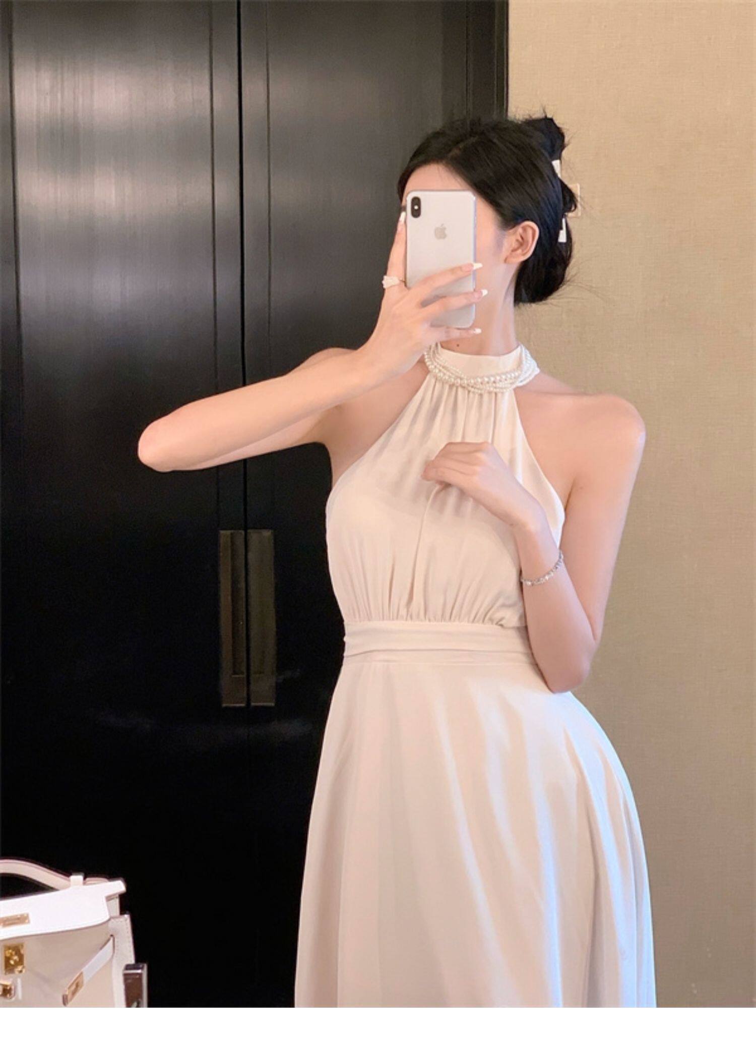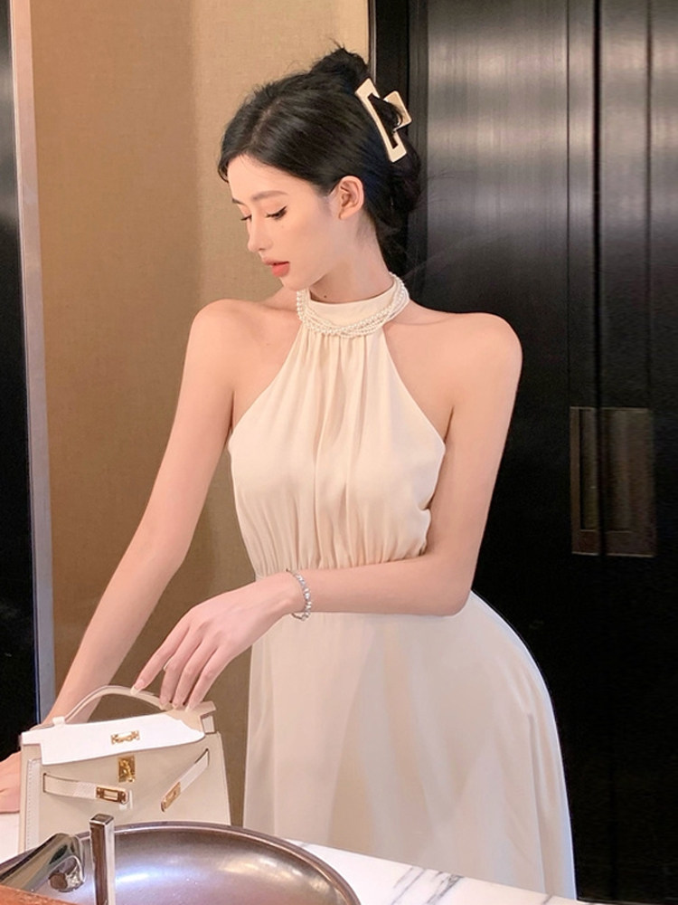 首元のパール装飾が上品な印象を与えるホルターネックデザインのワンピースです。
