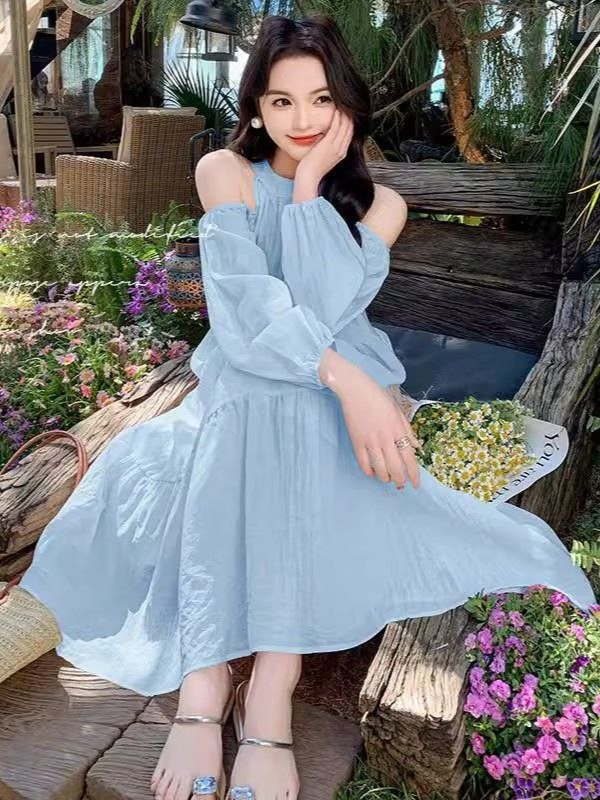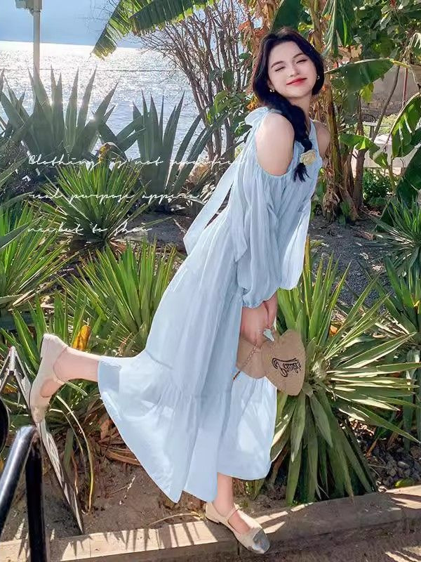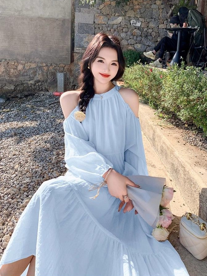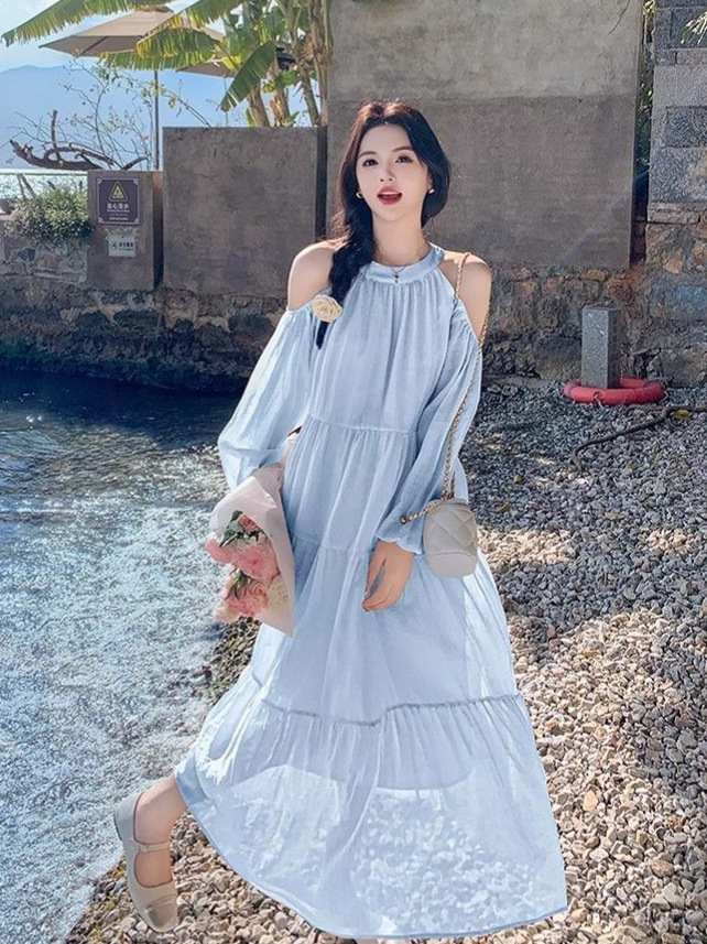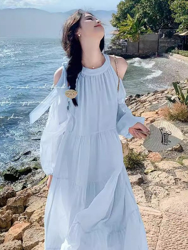 肩を華奢に見せるオフショルダーデザインと、ティアード切り替えが縦のラインを美しく演出します。