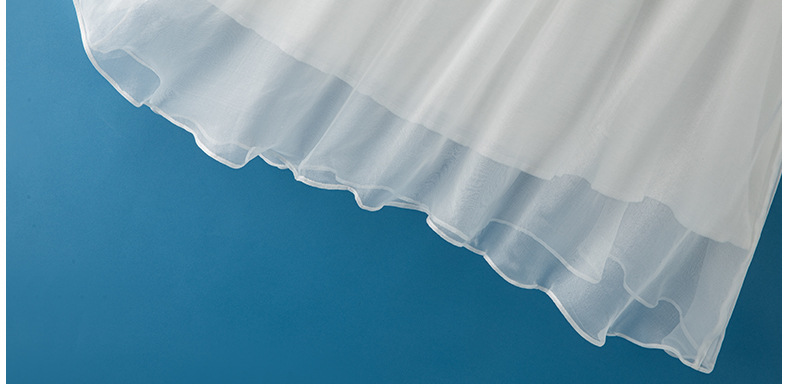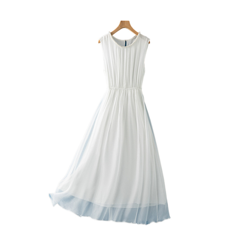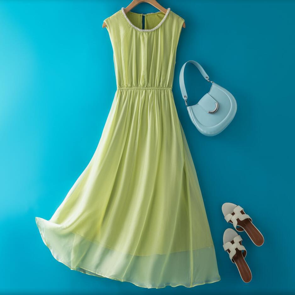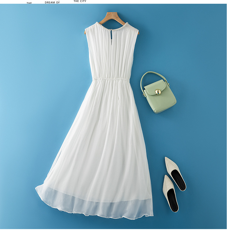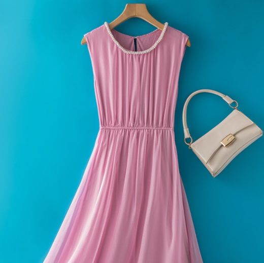 軽やかなシフォン素材を使用したノースリーブデザインで、ギャザーが美しいドレープを生み出します。