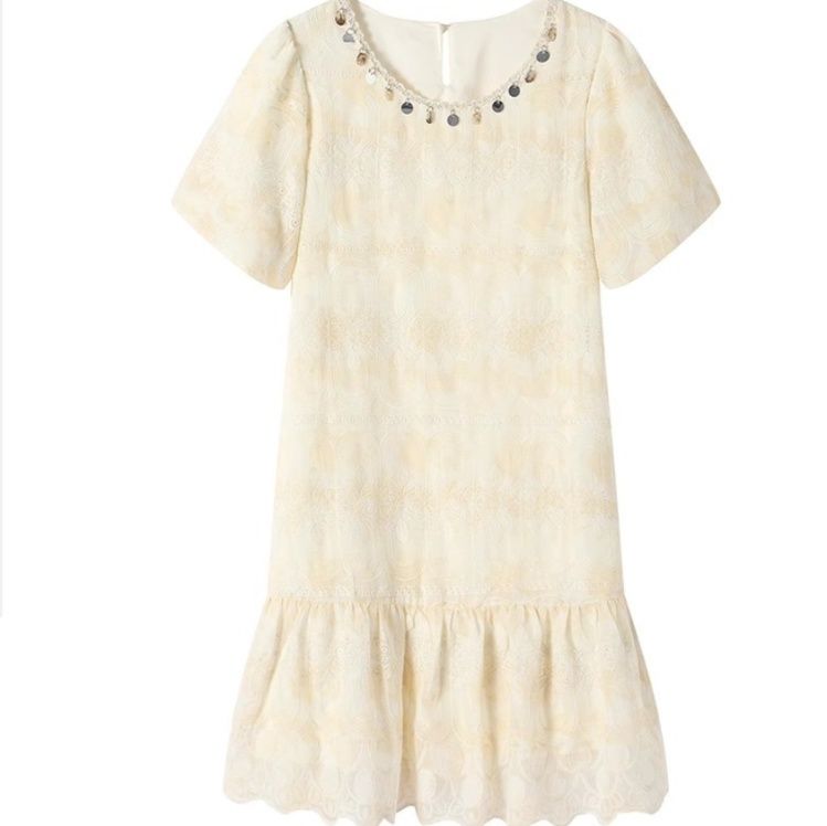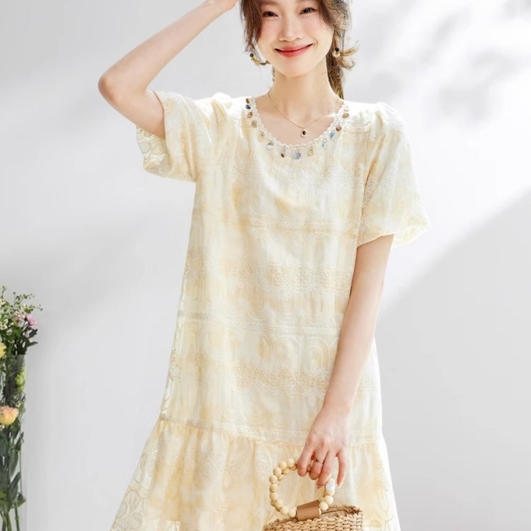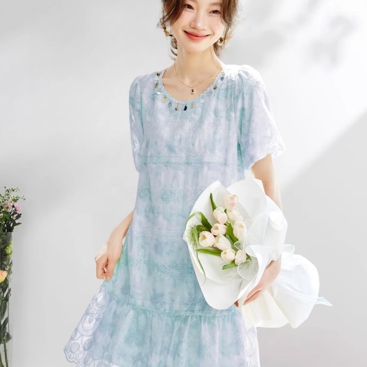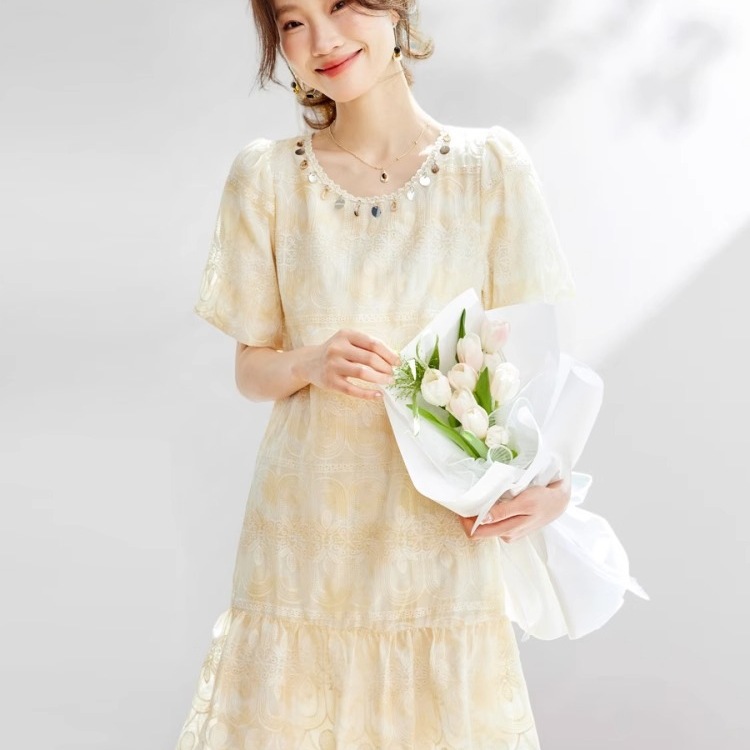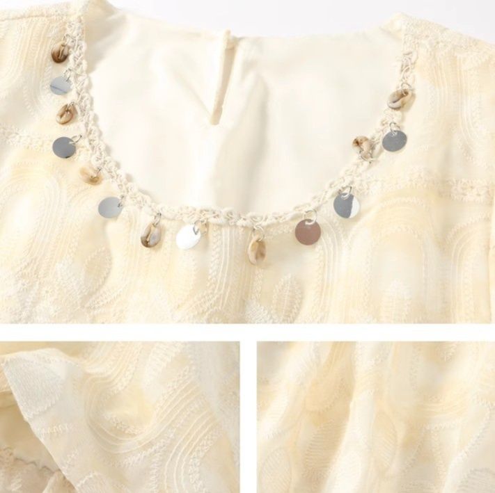 ふんわりとしたパフスリーブと裾のティアード切替が優雅な印象を与えます。