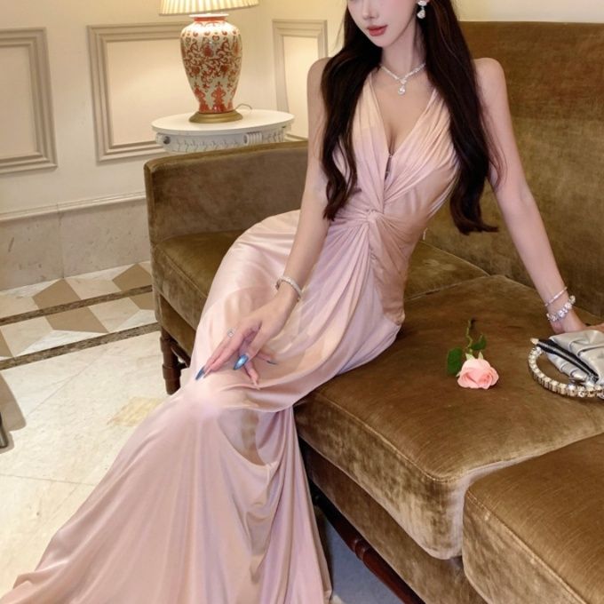 深めのVネックと胸元のツイストデザインが女性らしいシルエットを演出します。