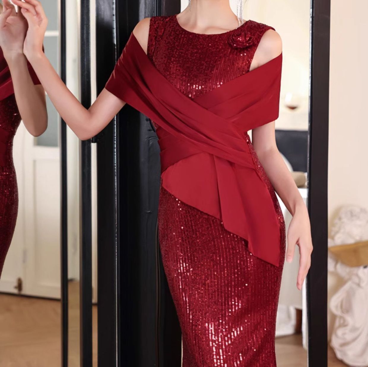 肩から流れるショールディテールが優雅さをプラスし、結婚式や二次会、パーティーシーンで注目を集める一着です。