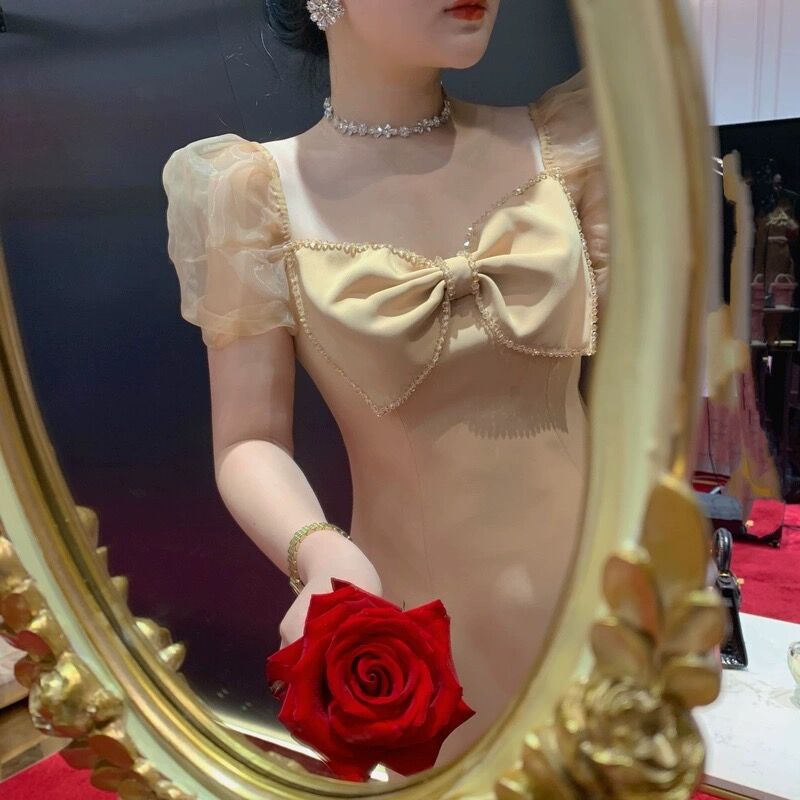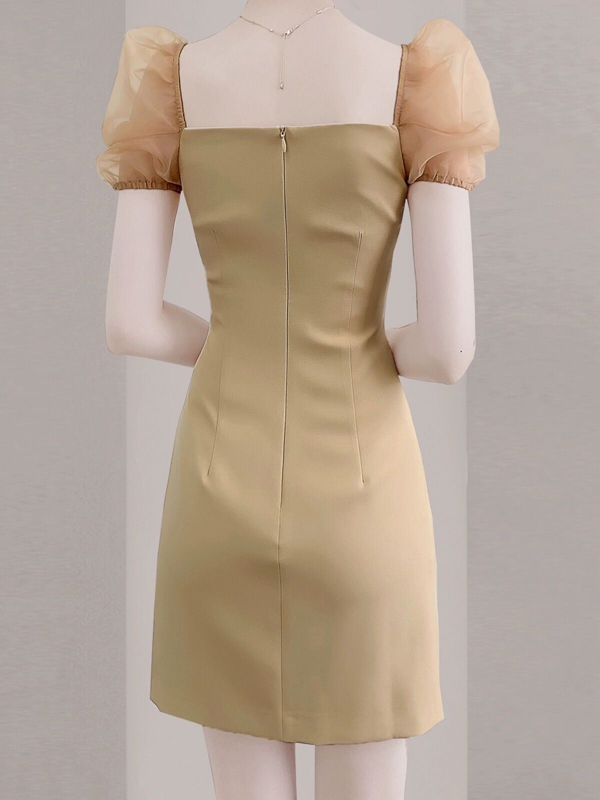 ふんわりとしたオーガンジー素材のパフスリーブが可愛らしさを演出し、タイトなシルエットが女性らしいボディラインを美しく引き立てます。