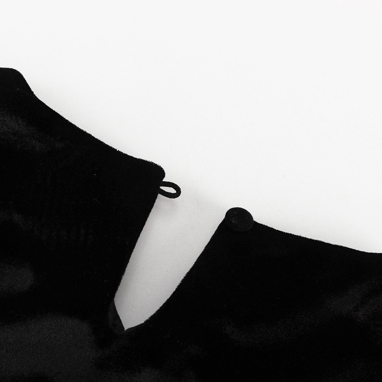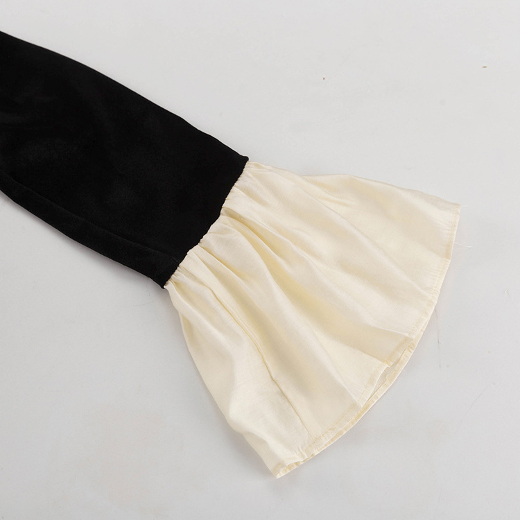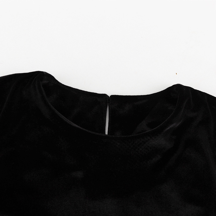 上品なベルベット素材のボディに、光沢のある異素材のバルーン袖と裾のフレアが印象的なデザイン。