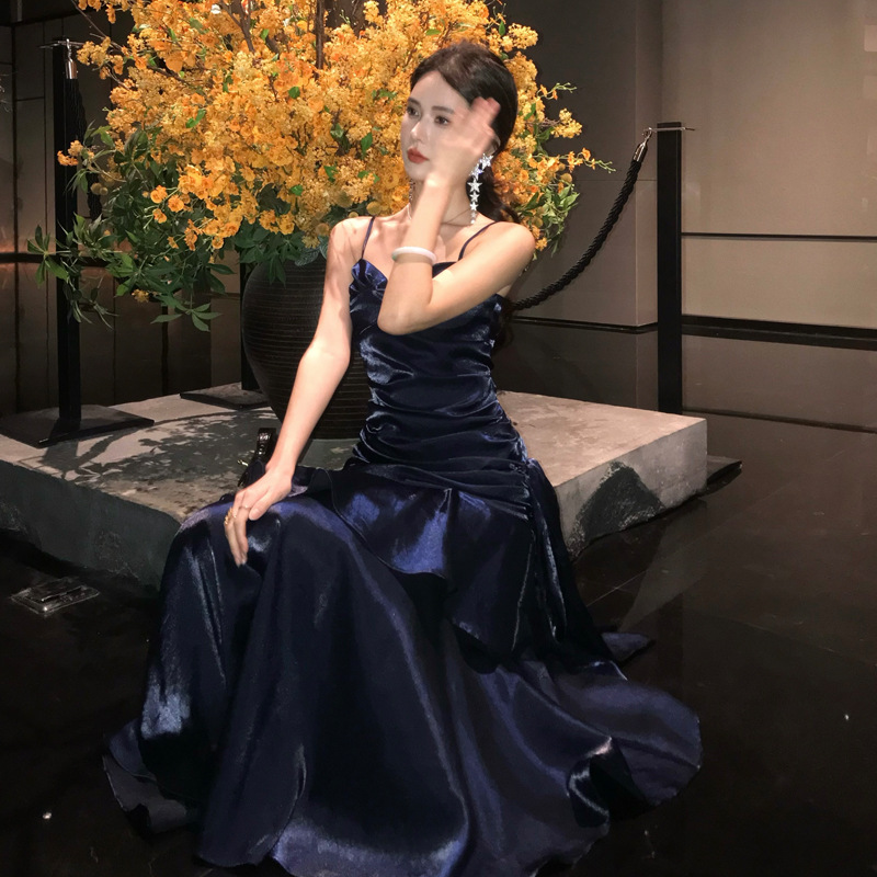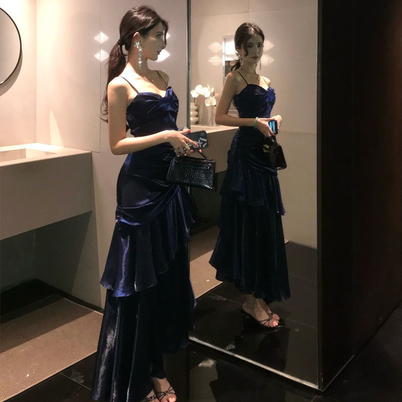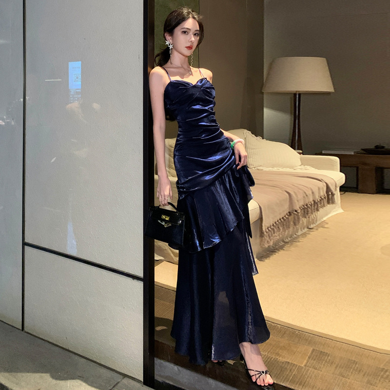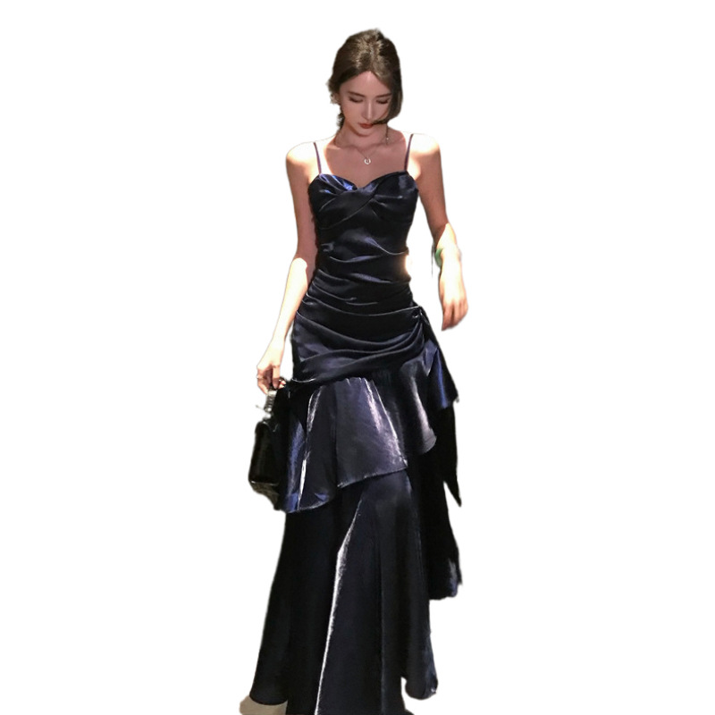 胸元のドレープデザインが女性らしさを演出し、細い肩紐が上品な印象を与えます。