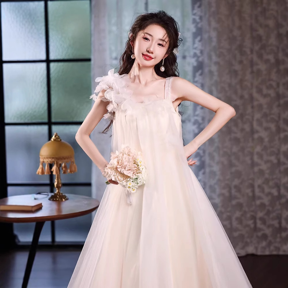 肩元に立体的な花の装飾を施した華やかなオケージョン ドレスです。