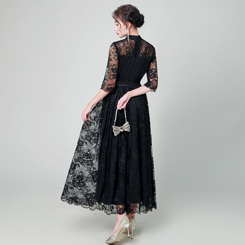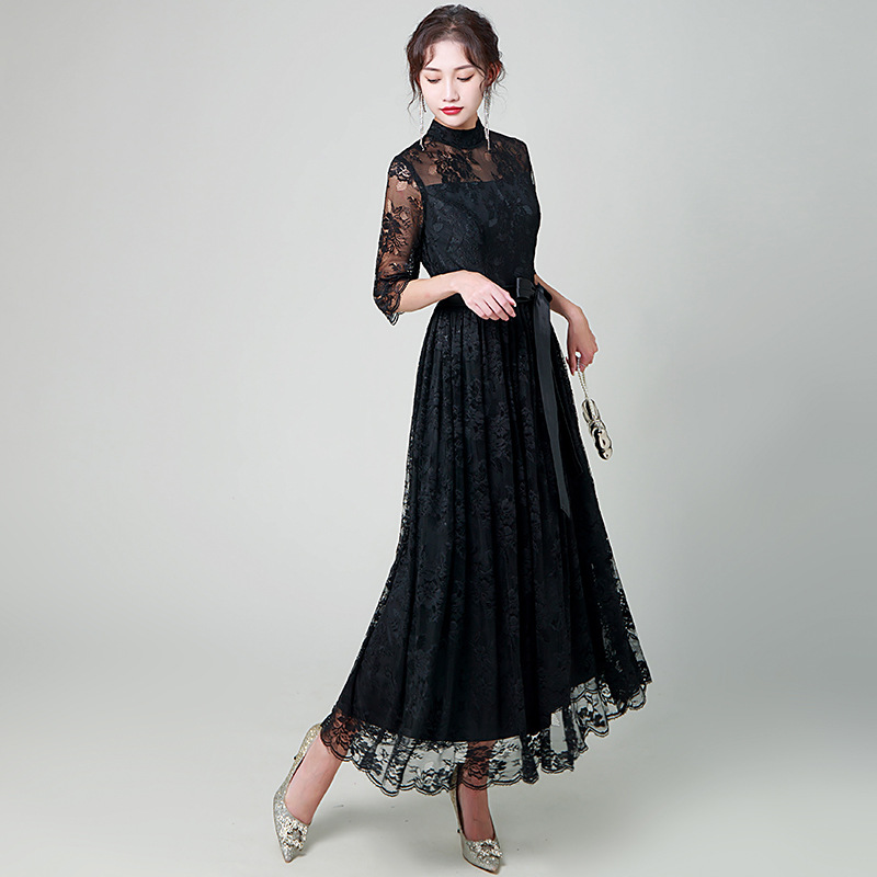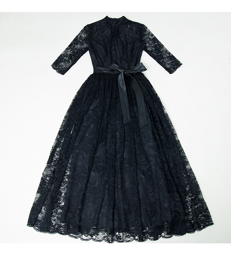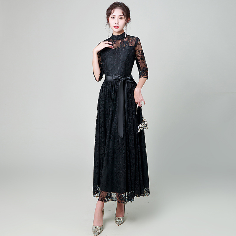 ハイネックデザインと透け感のある七分袖が女性らしさを演出し、ウエストのサテンリボンがスタイルアップ効果を発揮します。