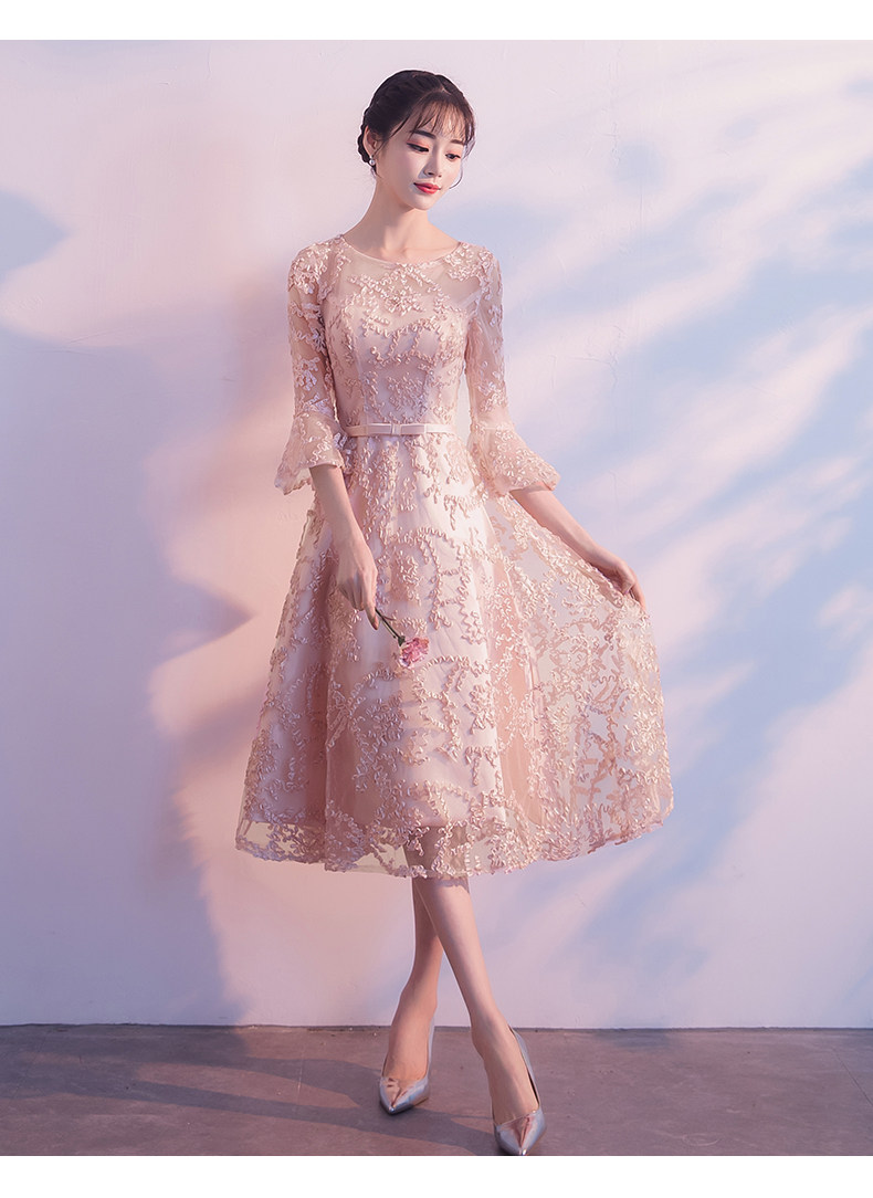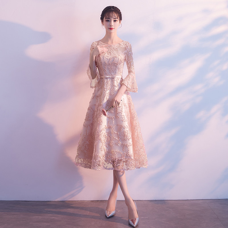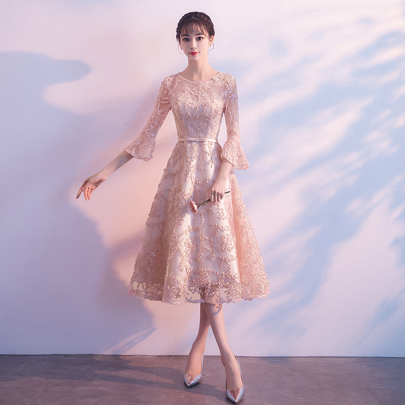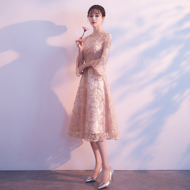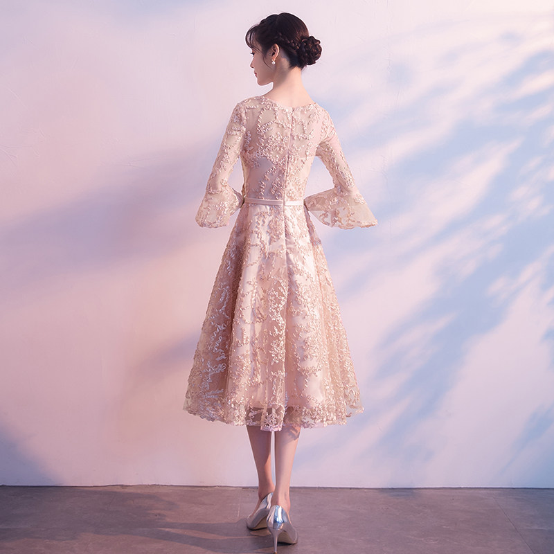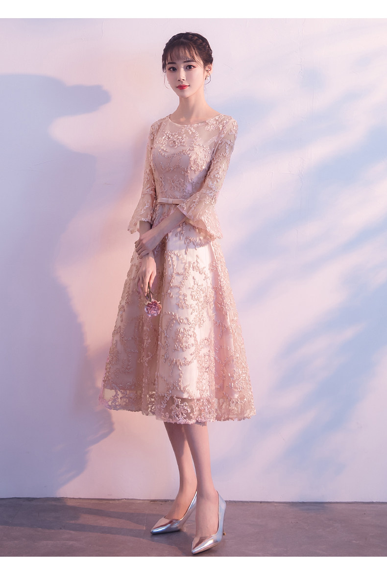 膝丈の程よい丈感で品格を保ちながらも、透け感のあるレース素材が軽やかな印象を与えます。