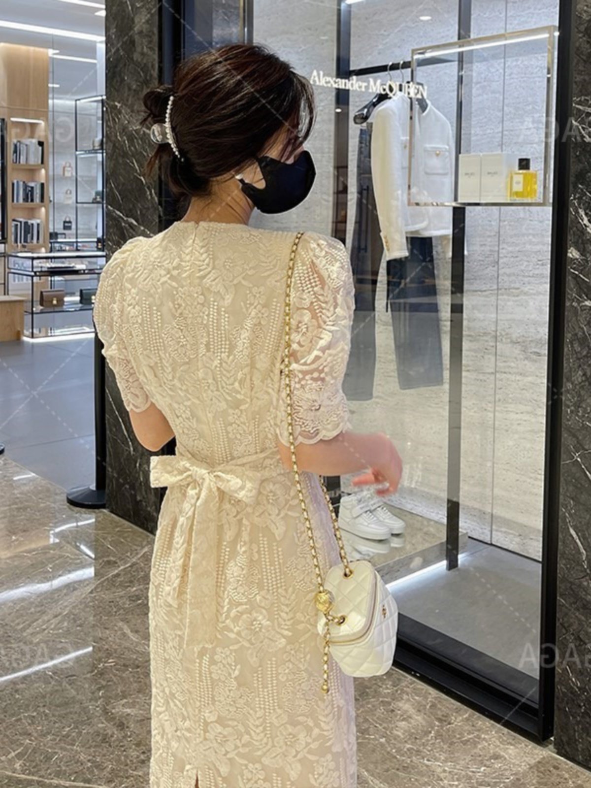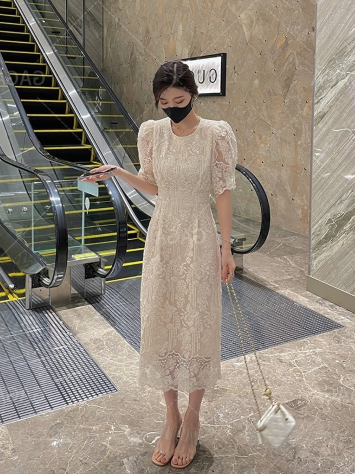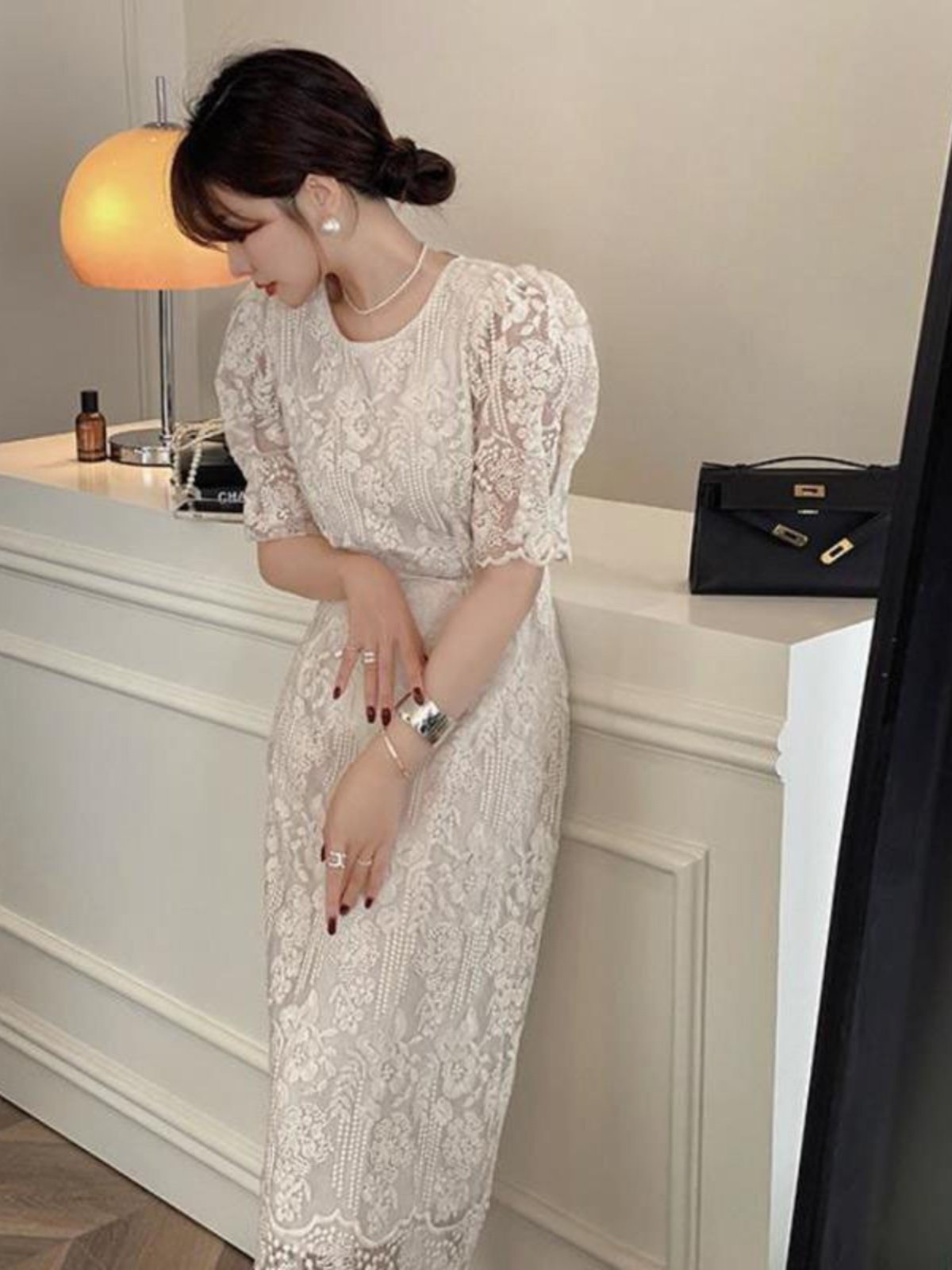 透け感のある総レースデザインが軽やかで洗練された印象を演出します。