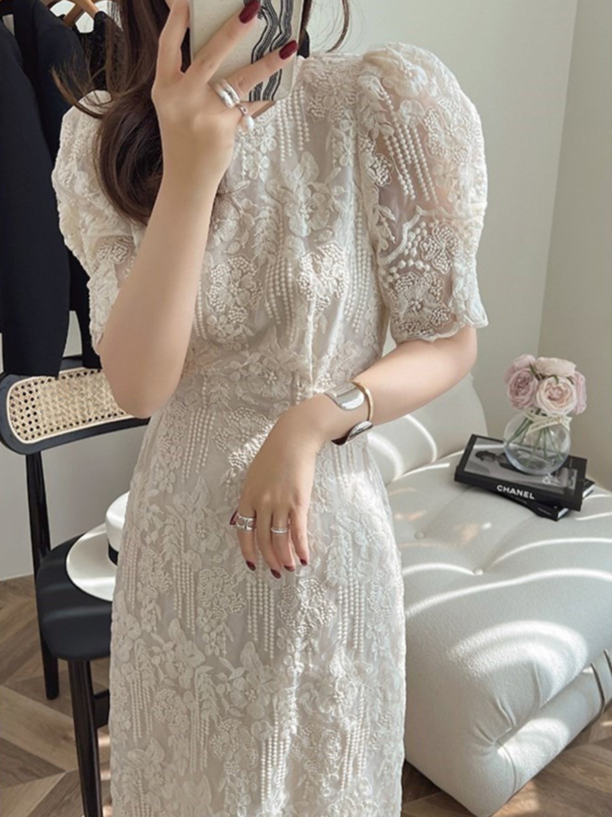 繊細な刺繍レースを全体にあしらった上品なワンピースです。