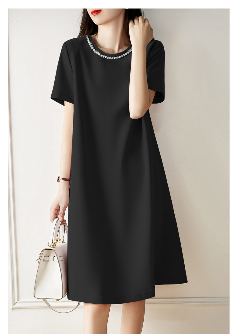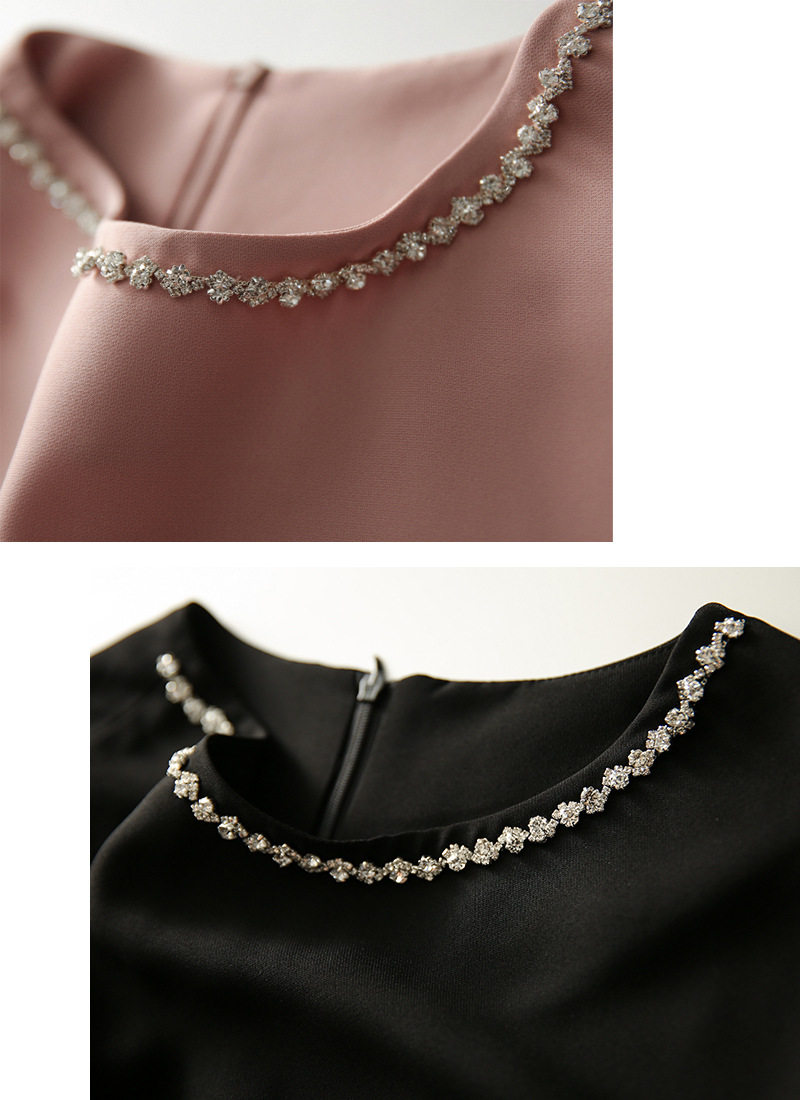 華やかなビジューが襟元を彩る、上品なオケージョン ドレスです。