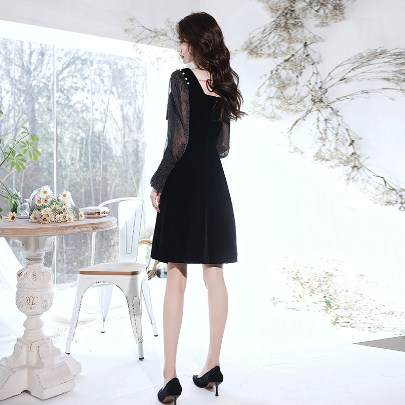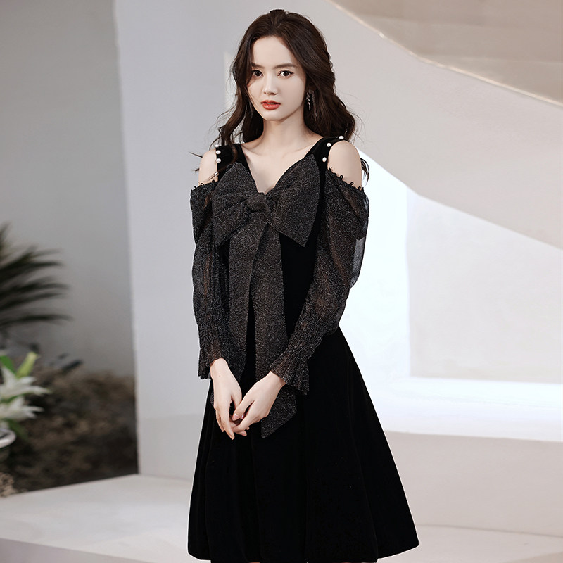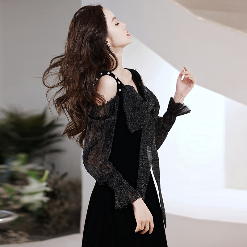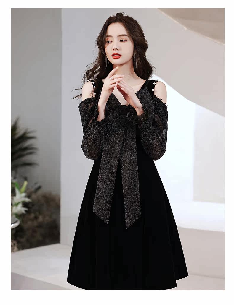 華やかなラメ素材の長袖とリボンが印象的なオケージョン ドレスです。
