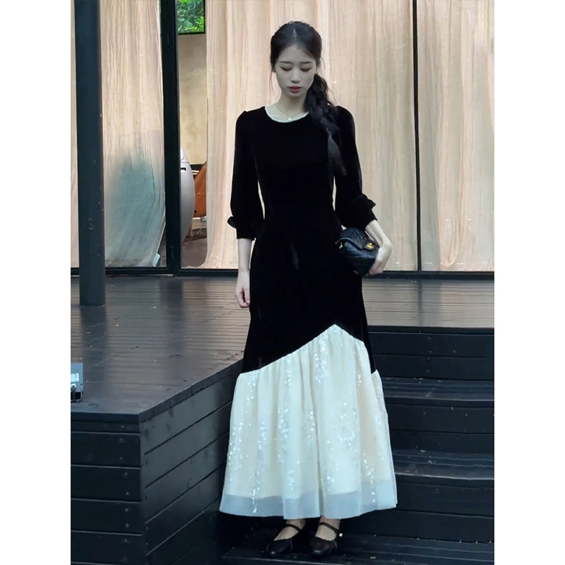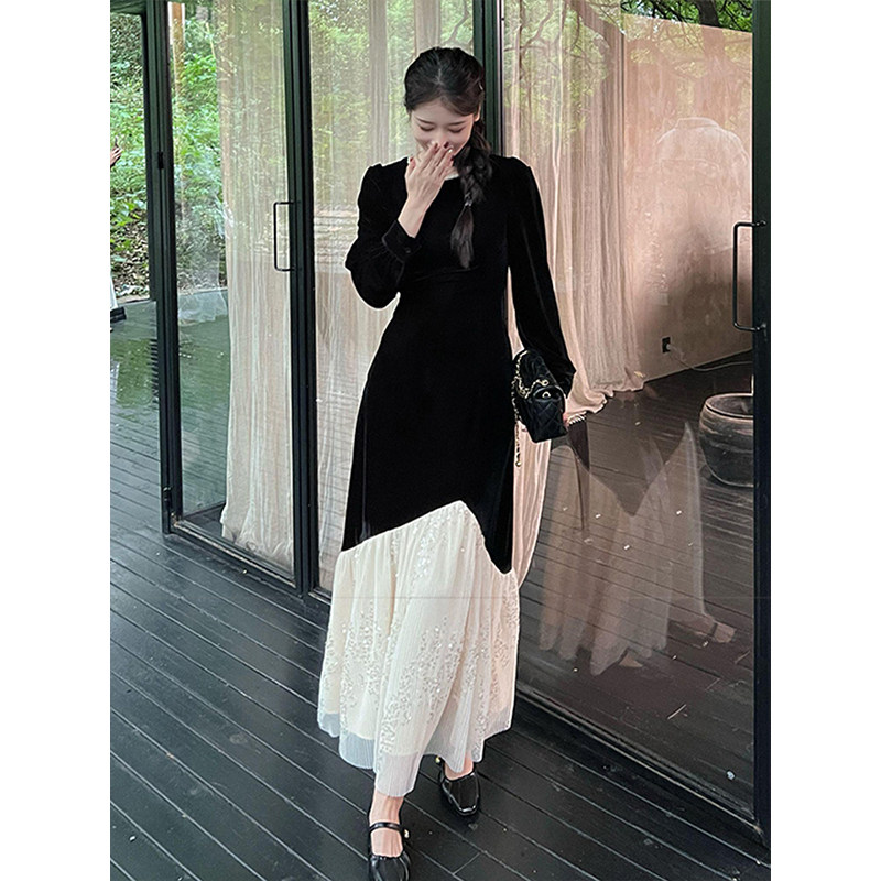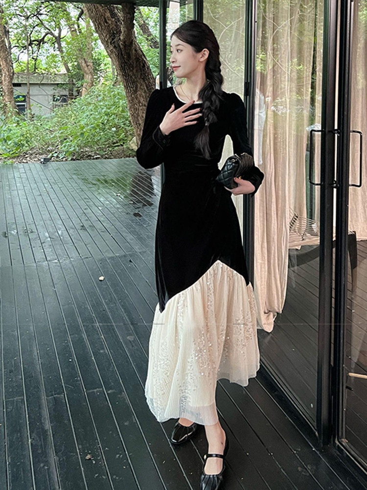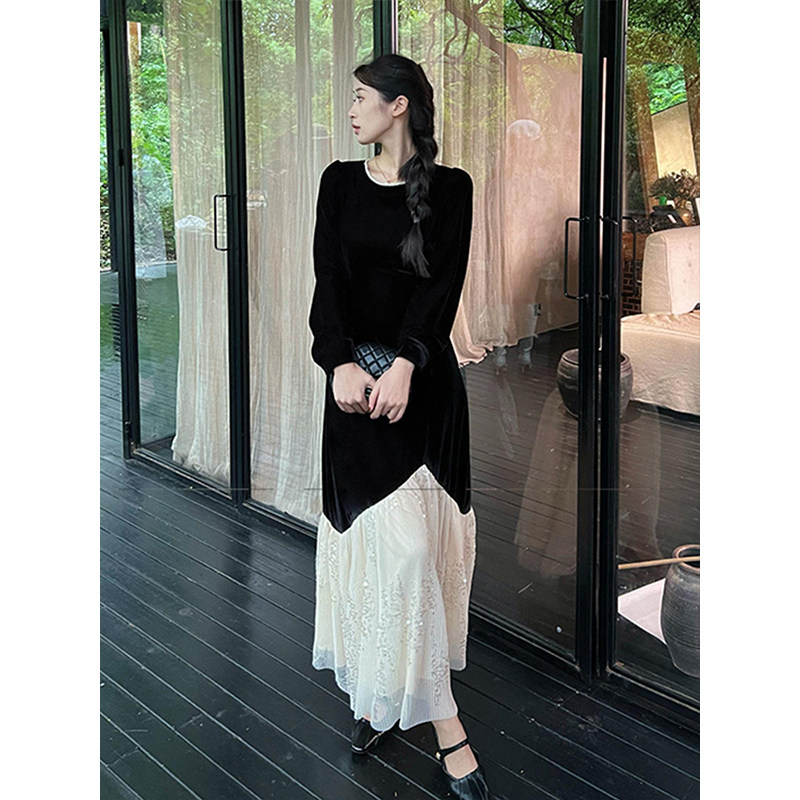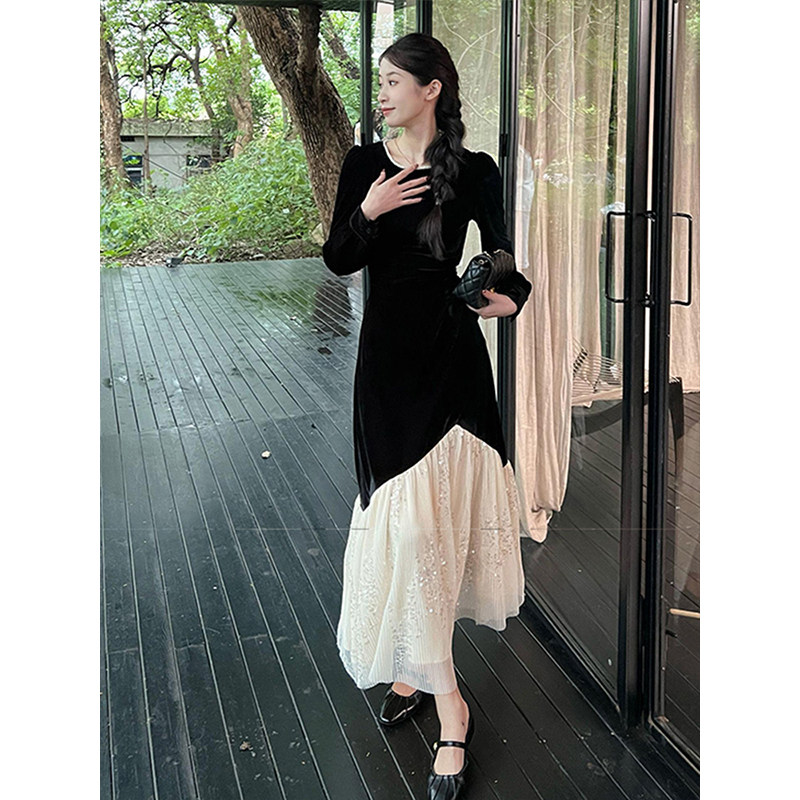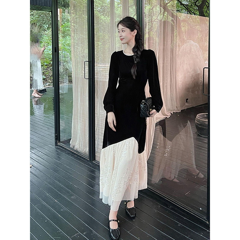 上品なベロア素材と繊細なチュールレースを組み合わせた重ね着風デザインのオケージョン ドレスです。