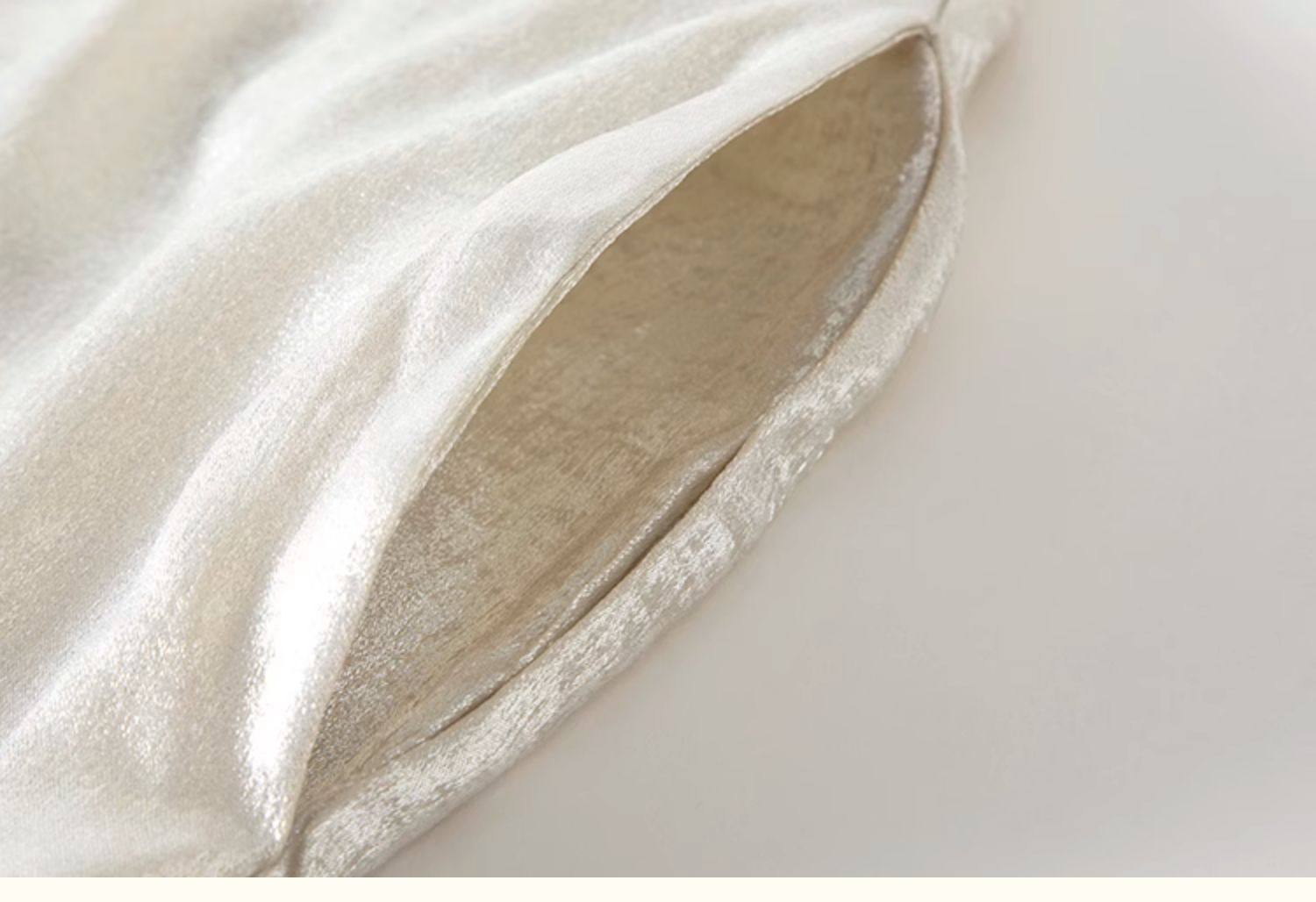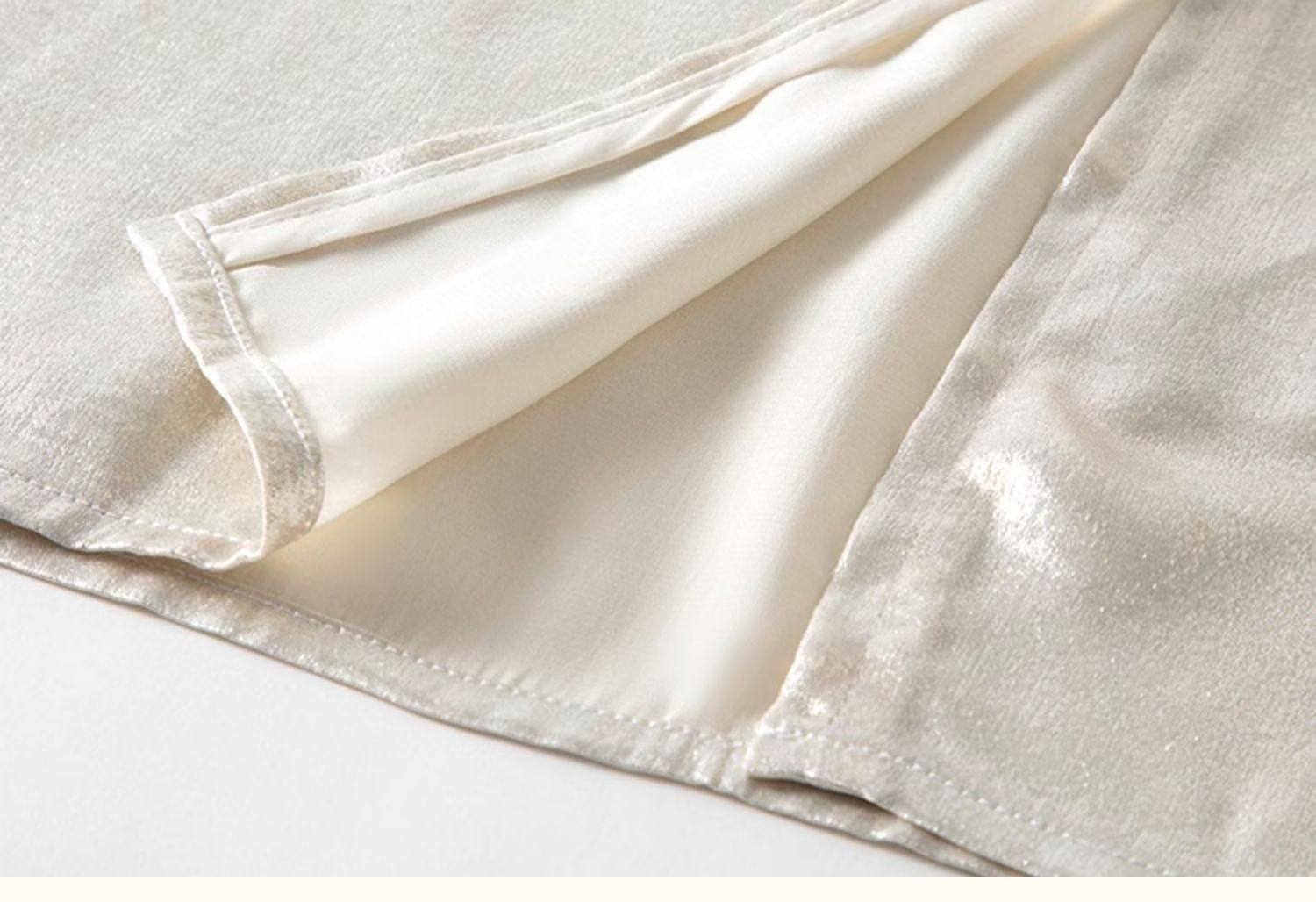 光沢のあるサテン生地が上品な華やかさをプラスし、ゆったりとしたシルエットが体型をカバーしながらも洗練された印象に。