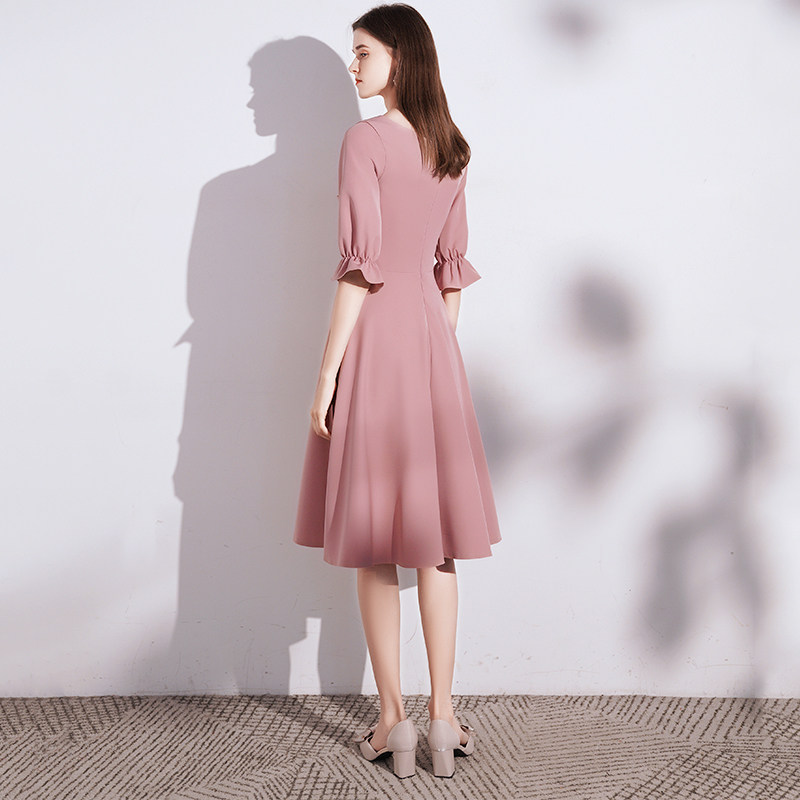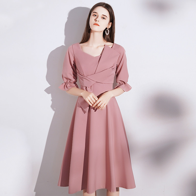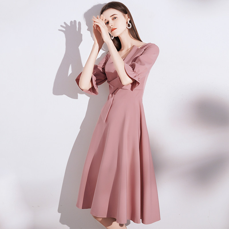 七分袖のふんわりとした袖口と、程よく広がるフレアスカートが女性らしさを引き立てます。