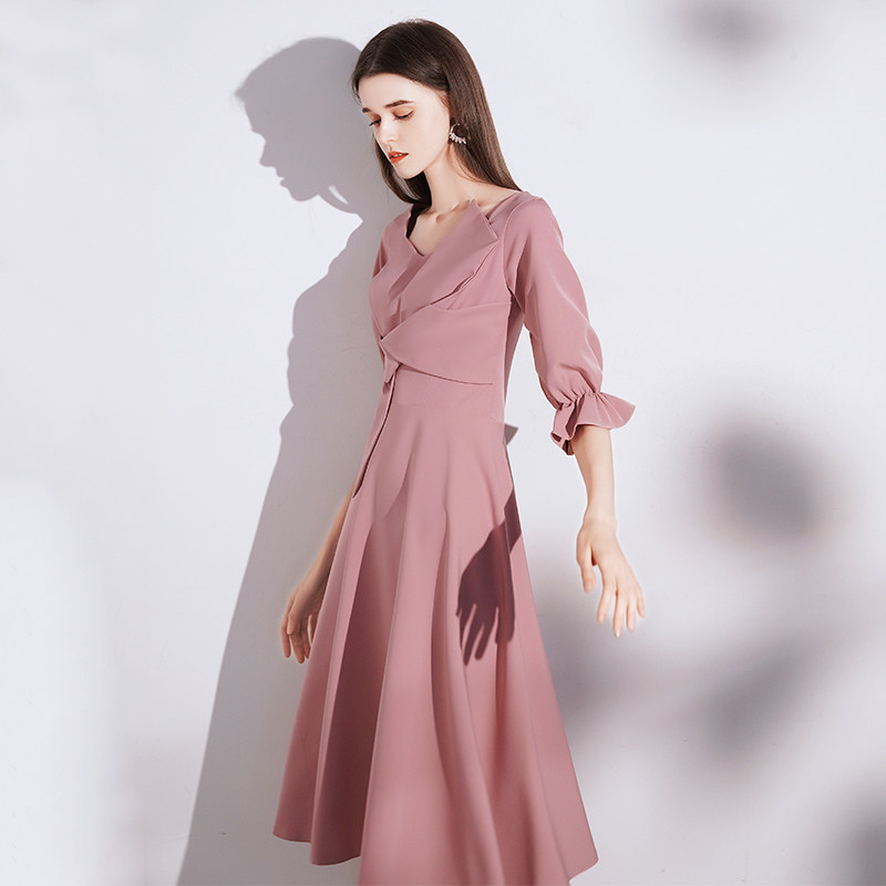 胸元の交差したドレープが上品で洗練された印象を演出し、女性らしい美しいシルエットを作り出します。
