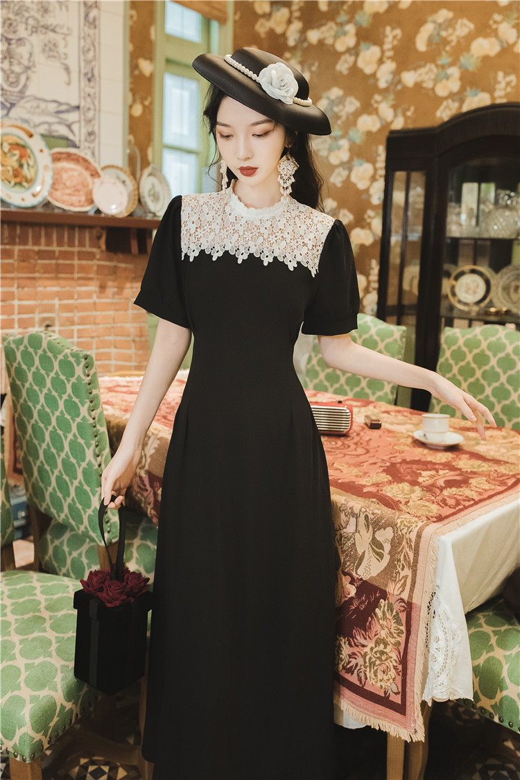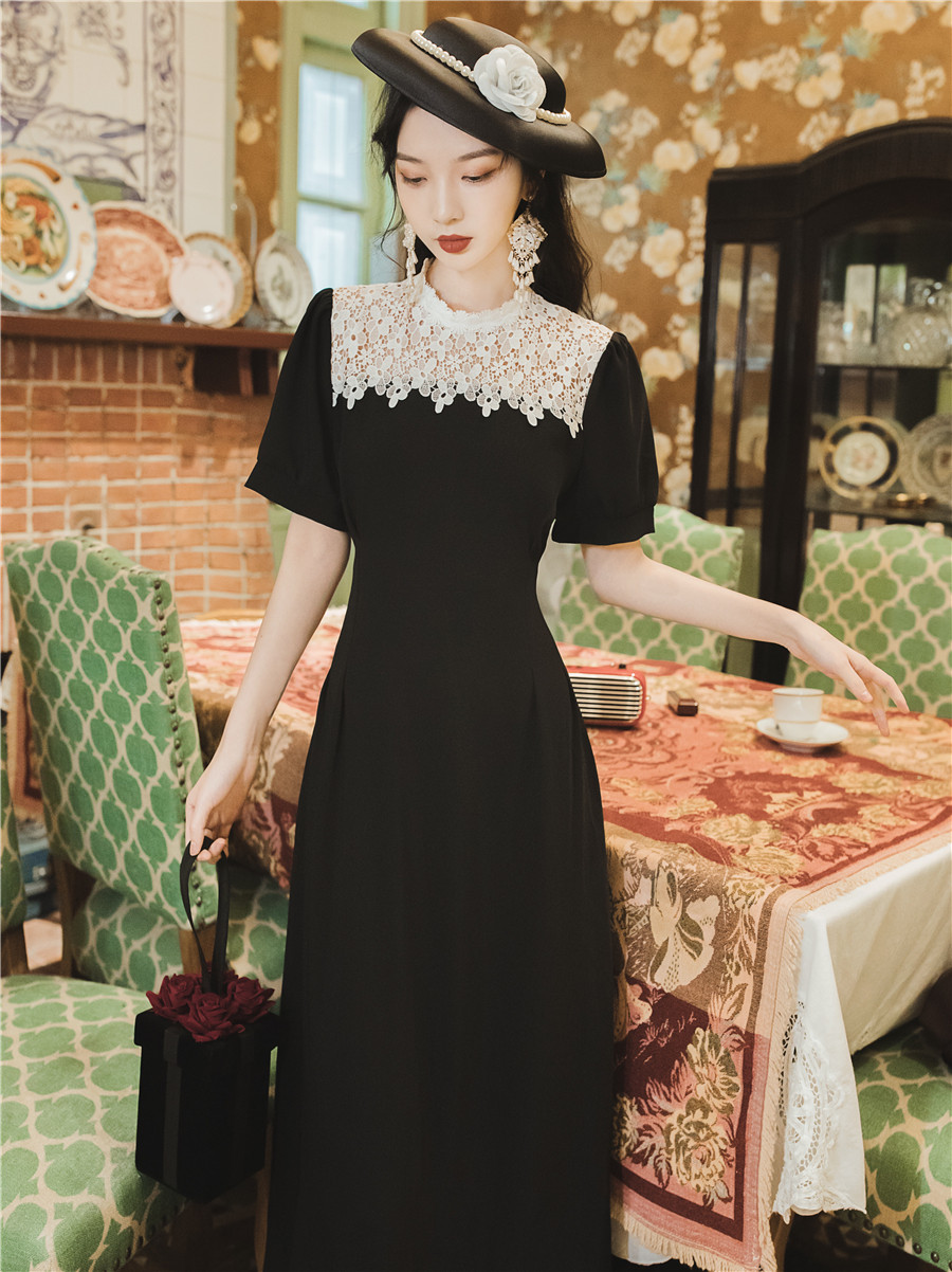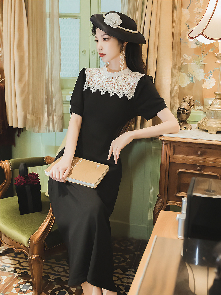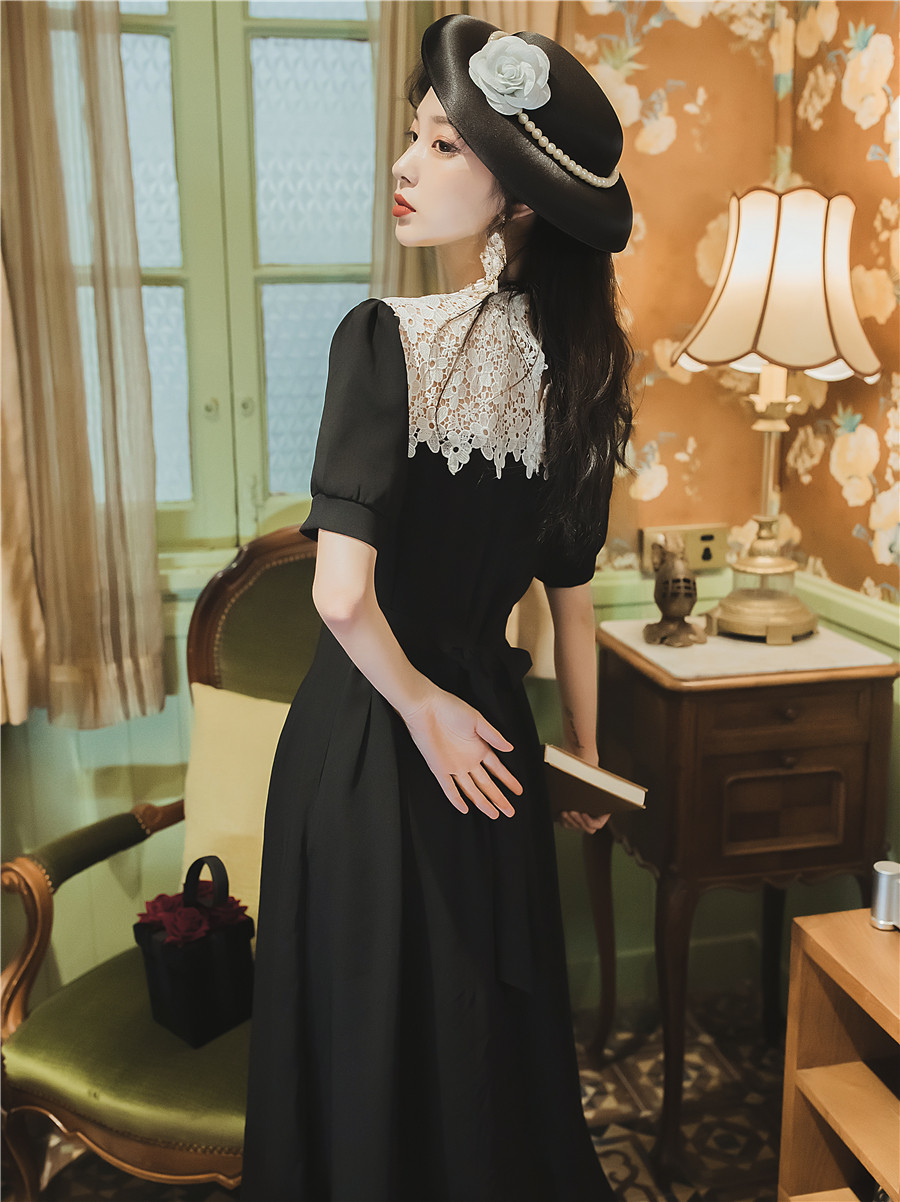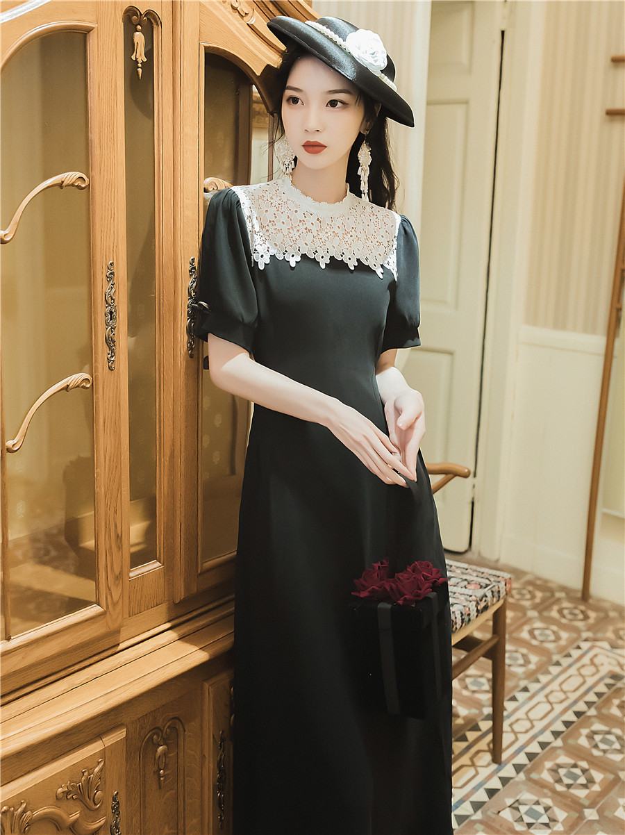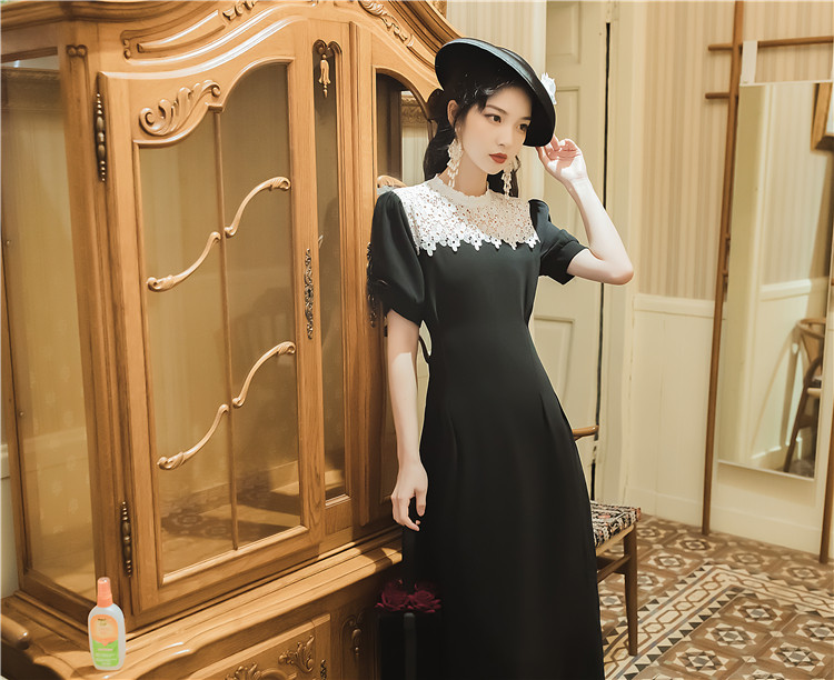 繊細な花柄レースの付け襟が華やかなオケージョン ドレスです。