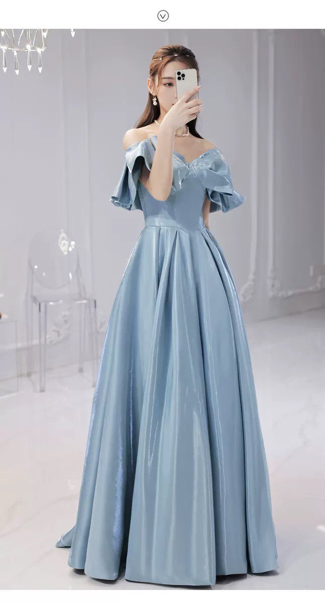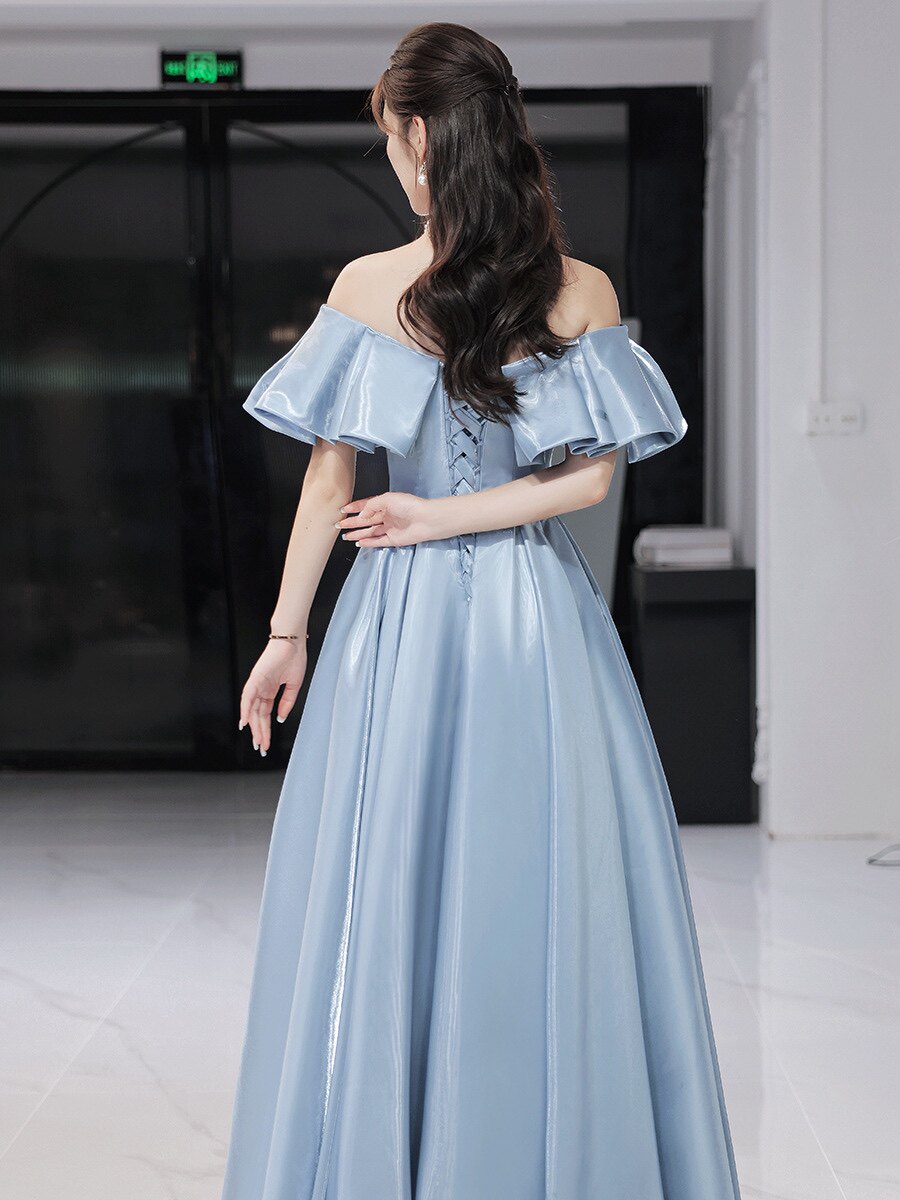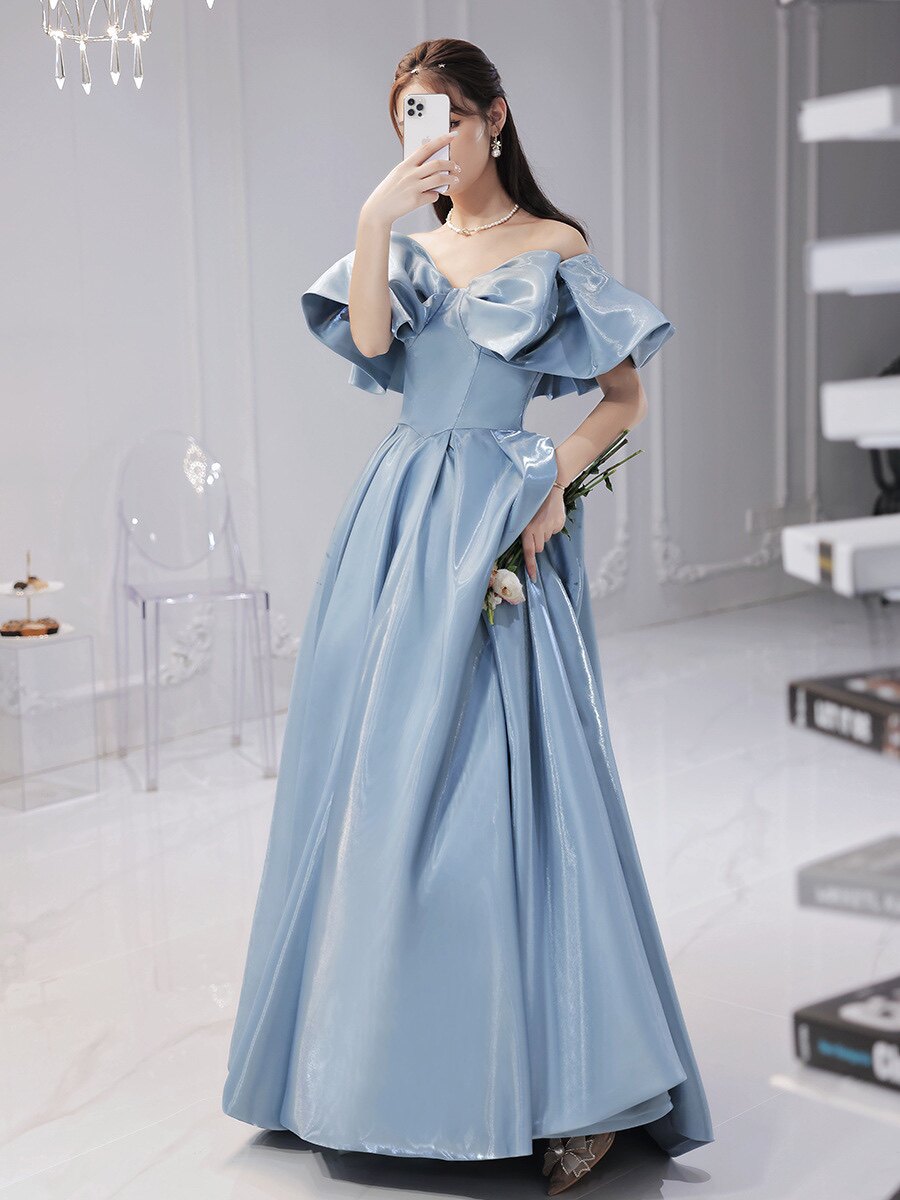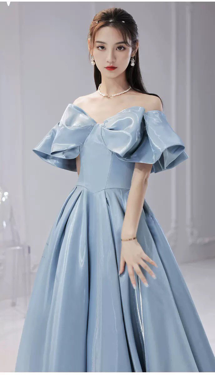 肩を美しく見せるフレアスリーブと、優雅に広がるボリュームたっぷりのスカートが上品な雰囲気を演出します。