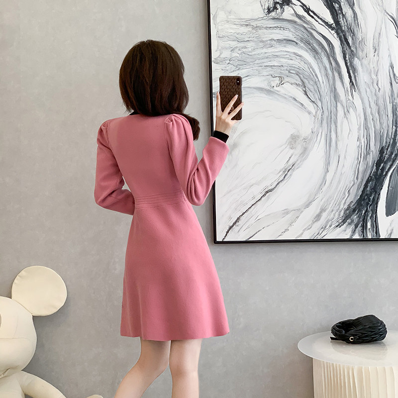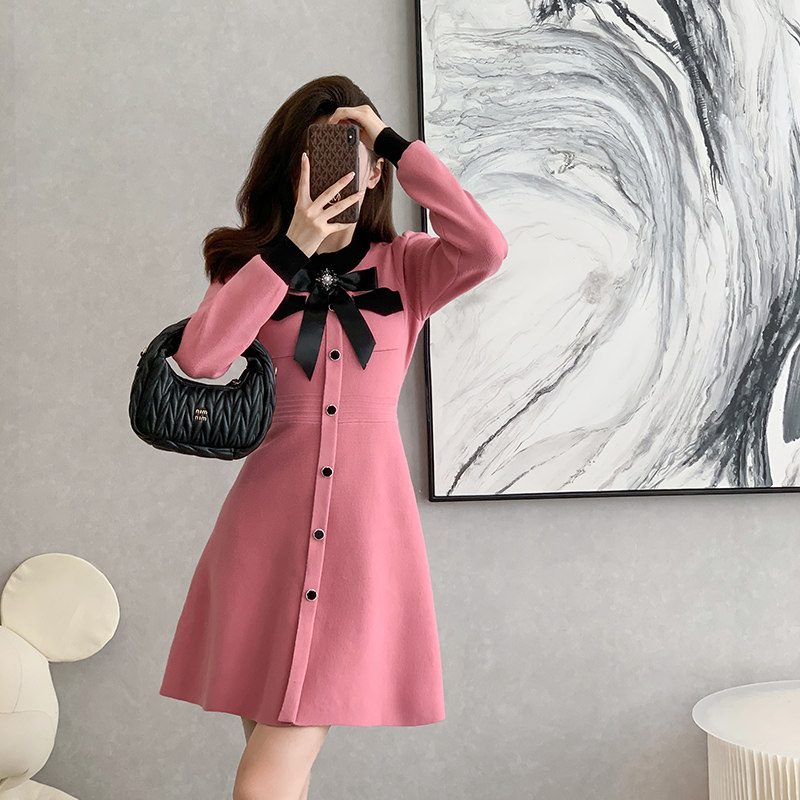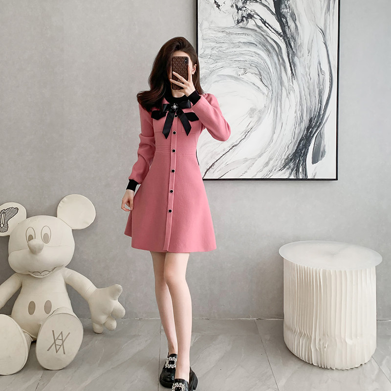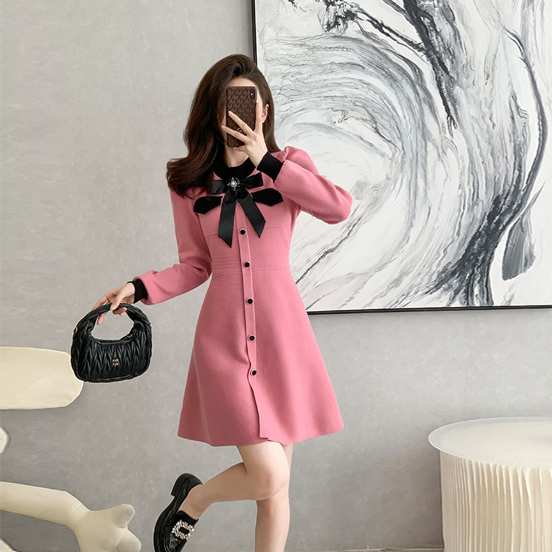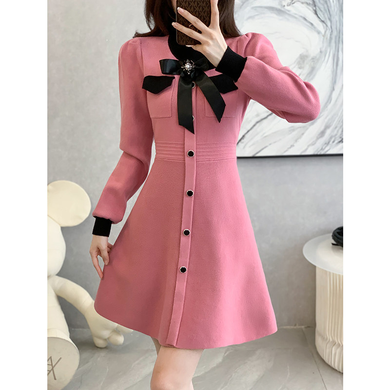 襟元の大きなリボンと袖口の配色デザインが上品で可愛らしい雰囲気を演出します。