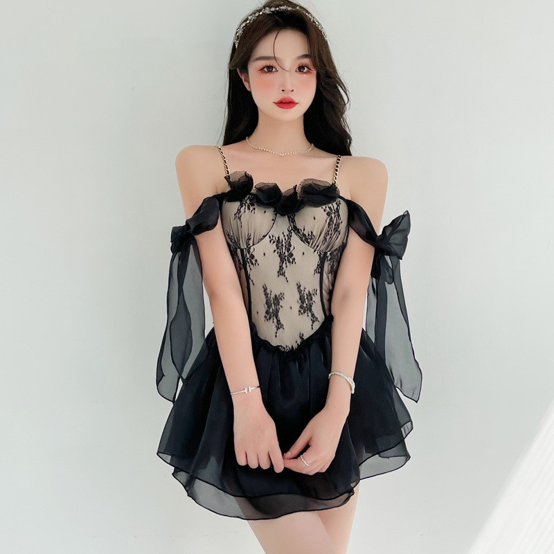 透け感のあるシアー素材とレース切替が上品さと色気を演出するワンピースです。