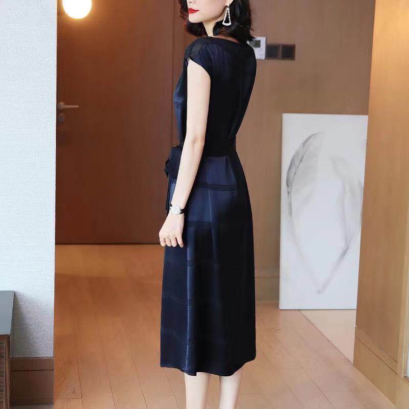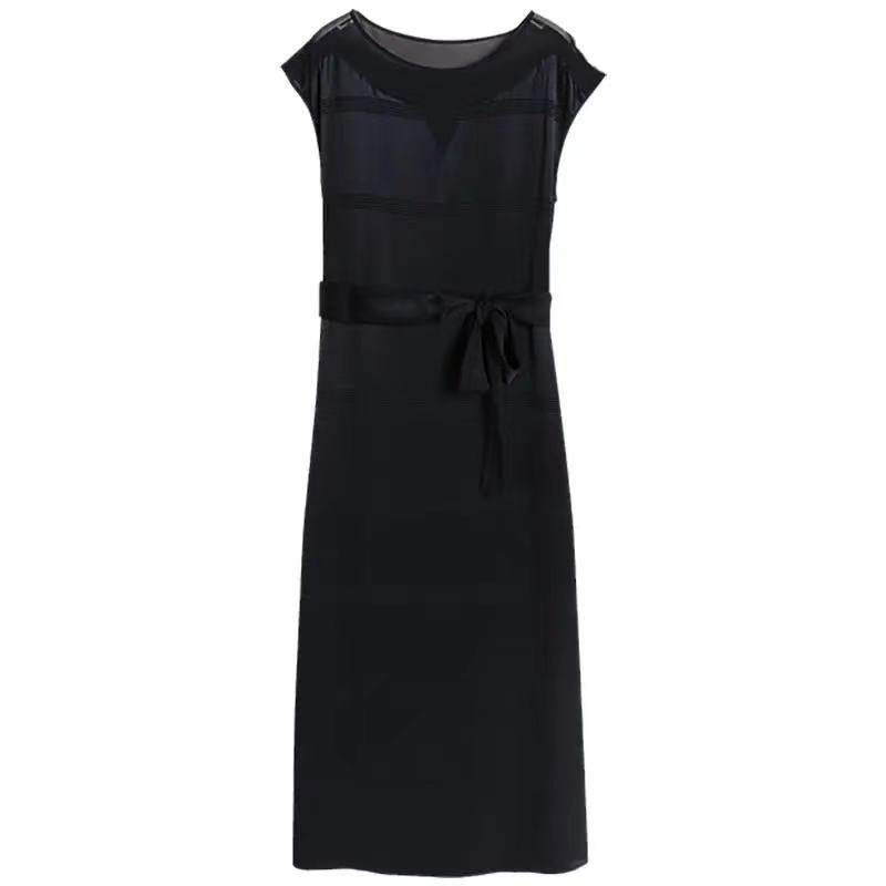 細いリボンベルトがウエストマークを作り、女性らしいシルエットと上品な装いを実現します。